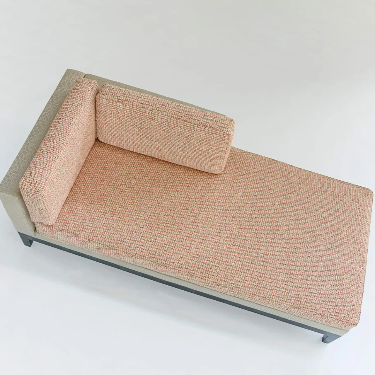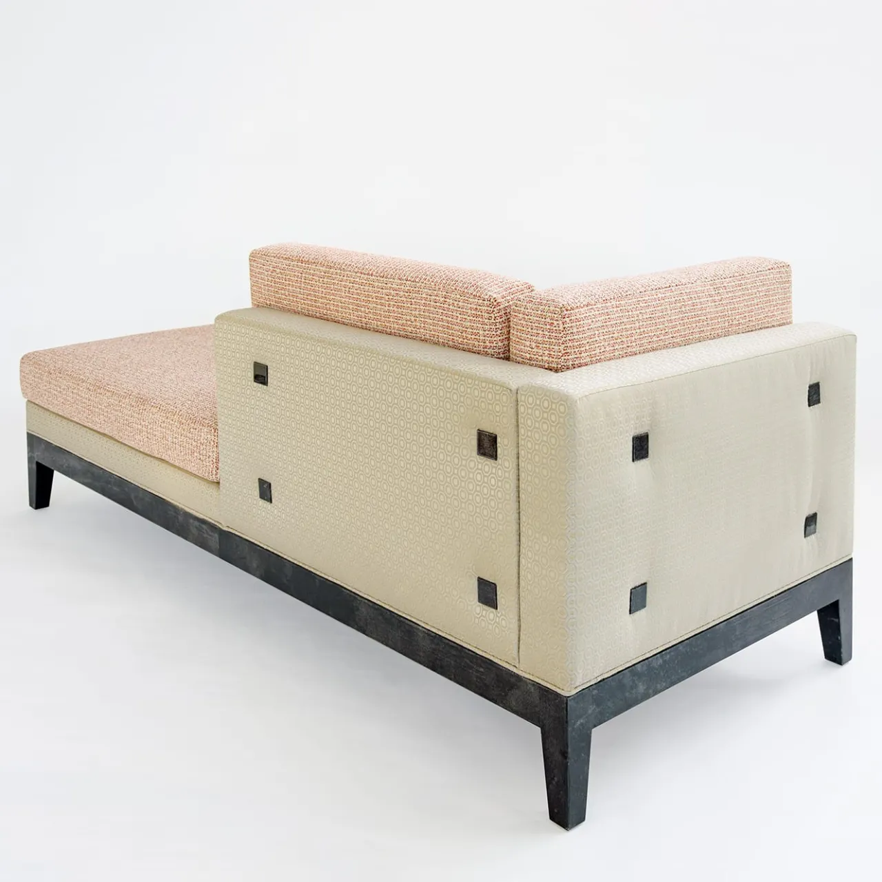 Comoda ed elegante dormeuse con base in legno rifinita con una pelle di capra grigio antracite ad alta lucentezza. Dettagli in pelle di capra sono presenti anche sul cuscino dello schienale. Non rivestito con diversi tessuti, abbinati a diverse fantasie e texture. Chiedete al Concierge le opzioni di personalizzazione.