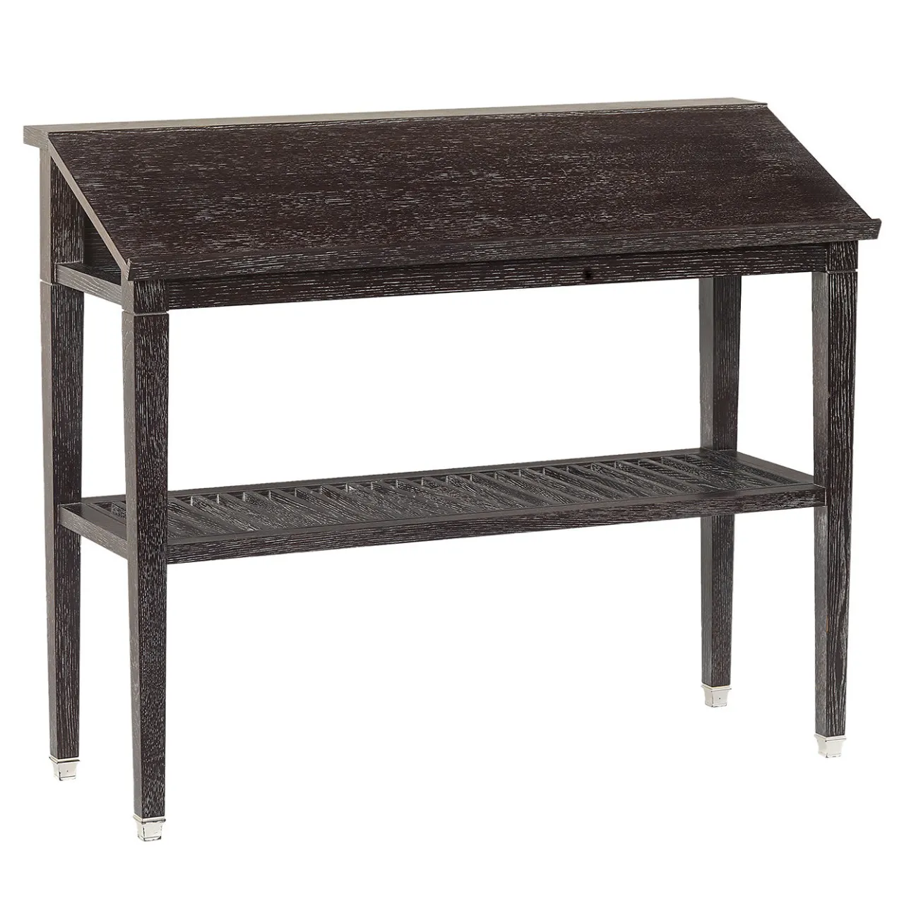 Originale per abbellire un ingresso o uno studio moderno o tradizionale, questo splendido reggilibro è uno stupendo progetto dell’architetto Michele Bonan per Chelini. Caratterizzato da linee pulite ed essenziali, è realizzato artigianalmente in legno di rovere rifinito in un colore scuro scelto e completato da piedini in ottone argentato. Il pezzo presenta un piano inclinato e un ripiano inferiore composto da robuste doghe.