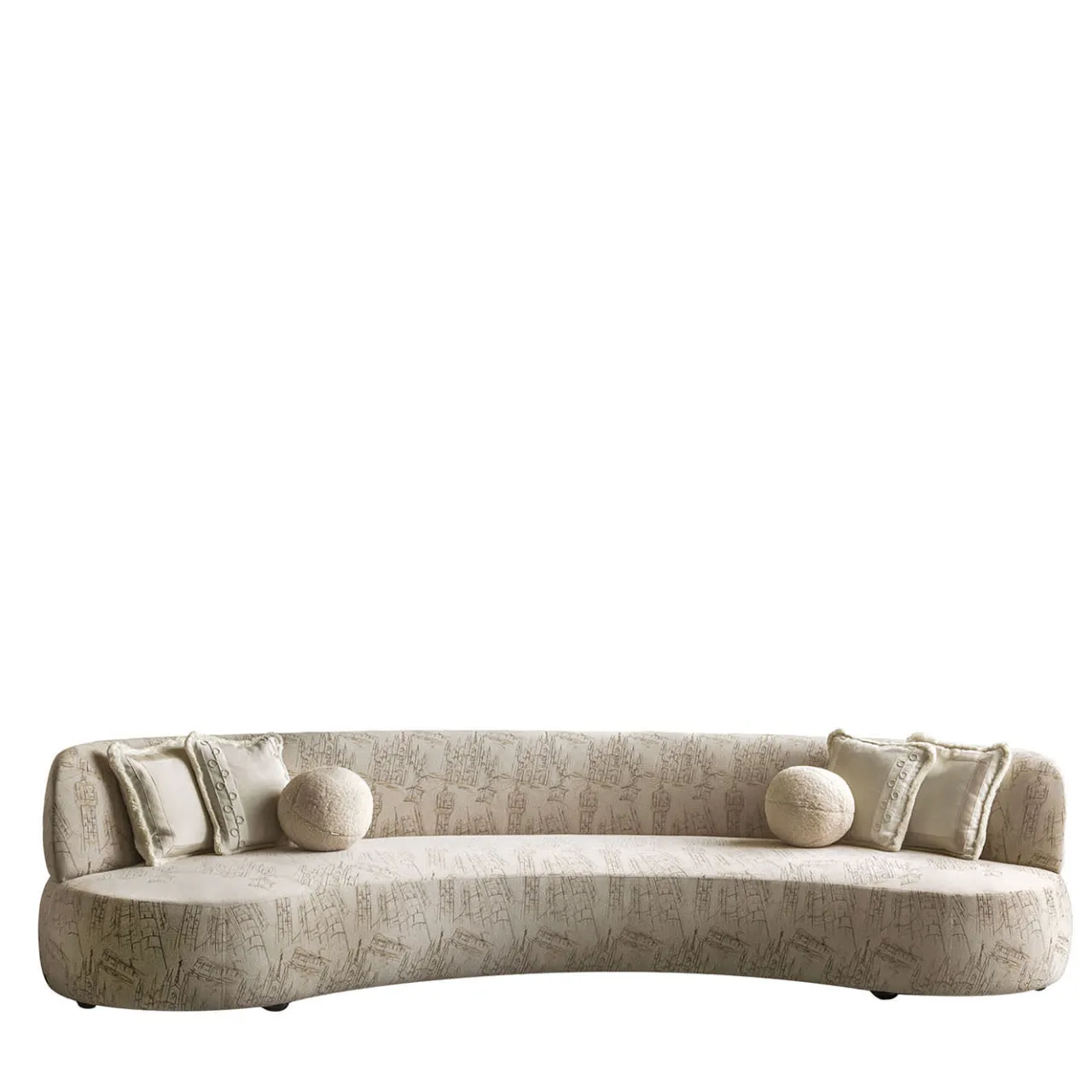 Minuscoli ricami manuali raffiguranti i simboli di Milano conferiscono a questo divano contemporaneo un’inconfondibile e raffinata allure sartoriale. Scultoreo nella sua silhouette curva e pulita, rivestito in morbido tessuto beige, è completo di quattro cuscini quadrati e rotondi coordinati, tutti inclusi nella consegna.