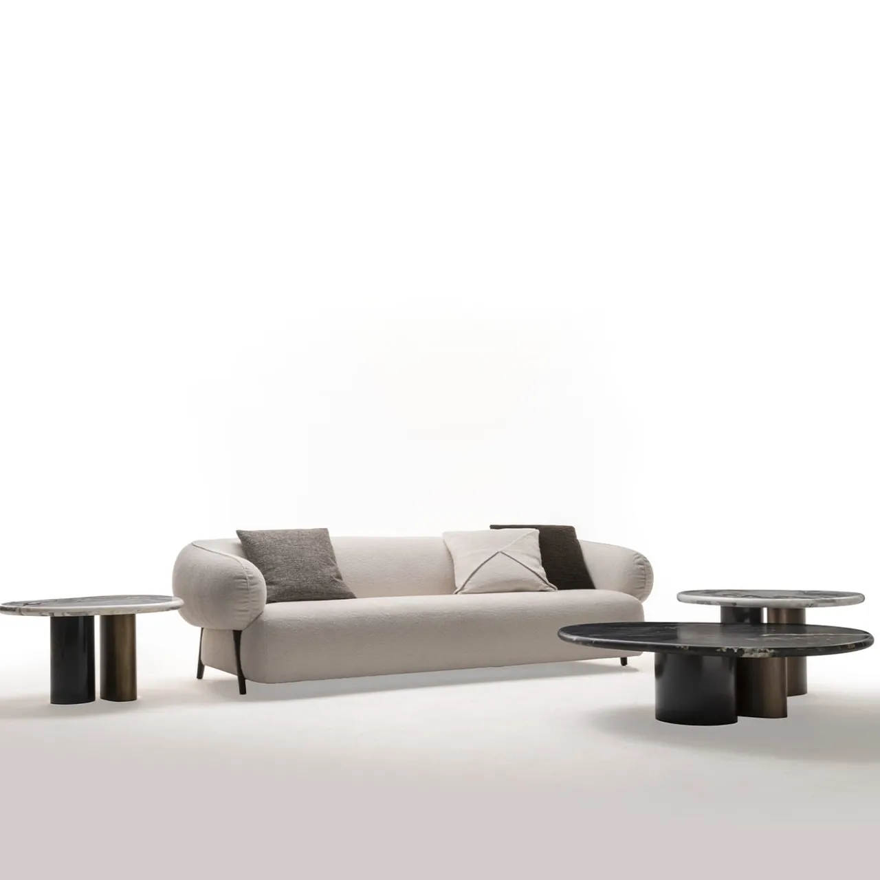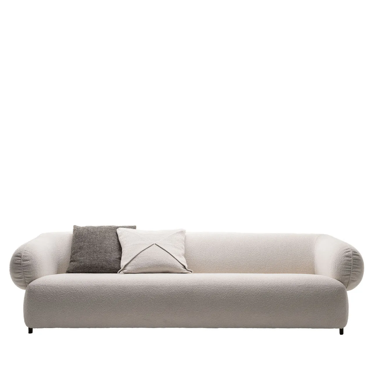 Tanto audace quanto minimalista, questo divano a tre posti promette momenti di impeccabile comfort speso contro i suoi volumi gonfi e avvolgenti. La ricca imbottitura – che caratterizza sia la seduta che lo schienale con braccioli leggermente inclinati – è sigillata da un sofisticato rivestimento in tessuto boucle bianco. I piedi affusolati in frassino tinto grigio completano il design aggiungendo un pizzico di profondità cromatica.