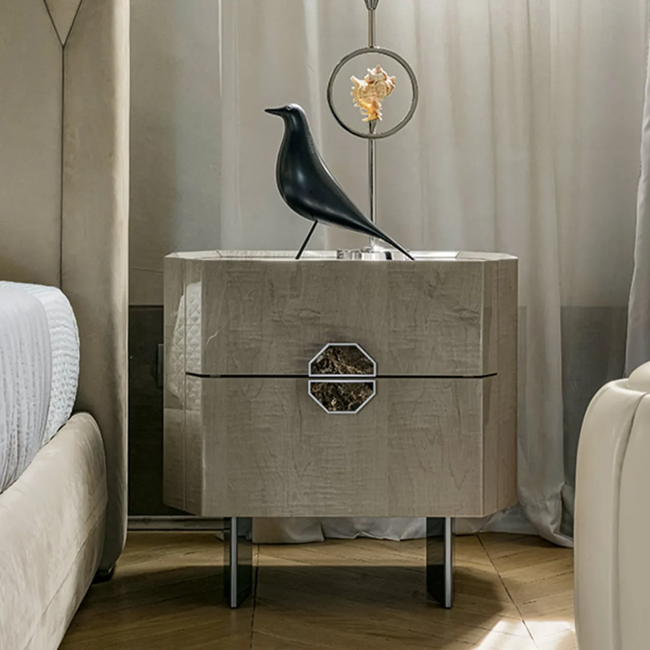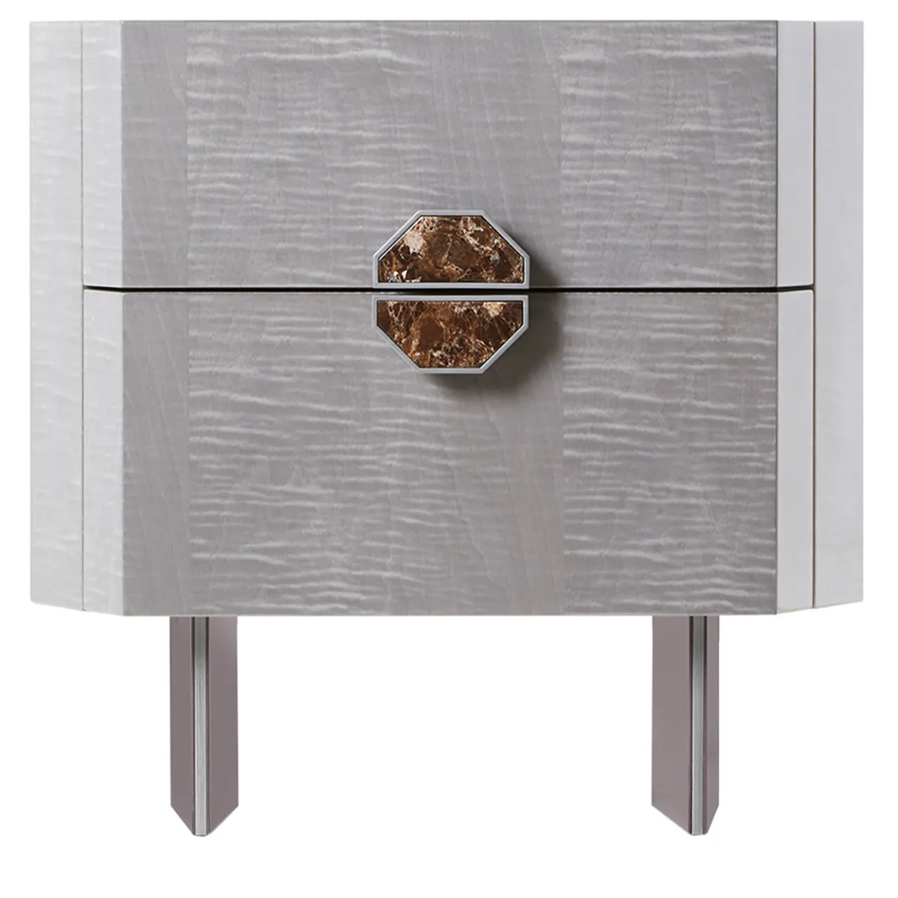 Questa elegante cassettiera a 2 cassetti ha un piano in legno, finiture in metallo e gambe laccate. L’apertura è facilitata da una preziosa maniglia in marmo Emperador Dark. Caratterizzata dalla finitura lucida Lupo, i dettagli sono in metallo Nickel.