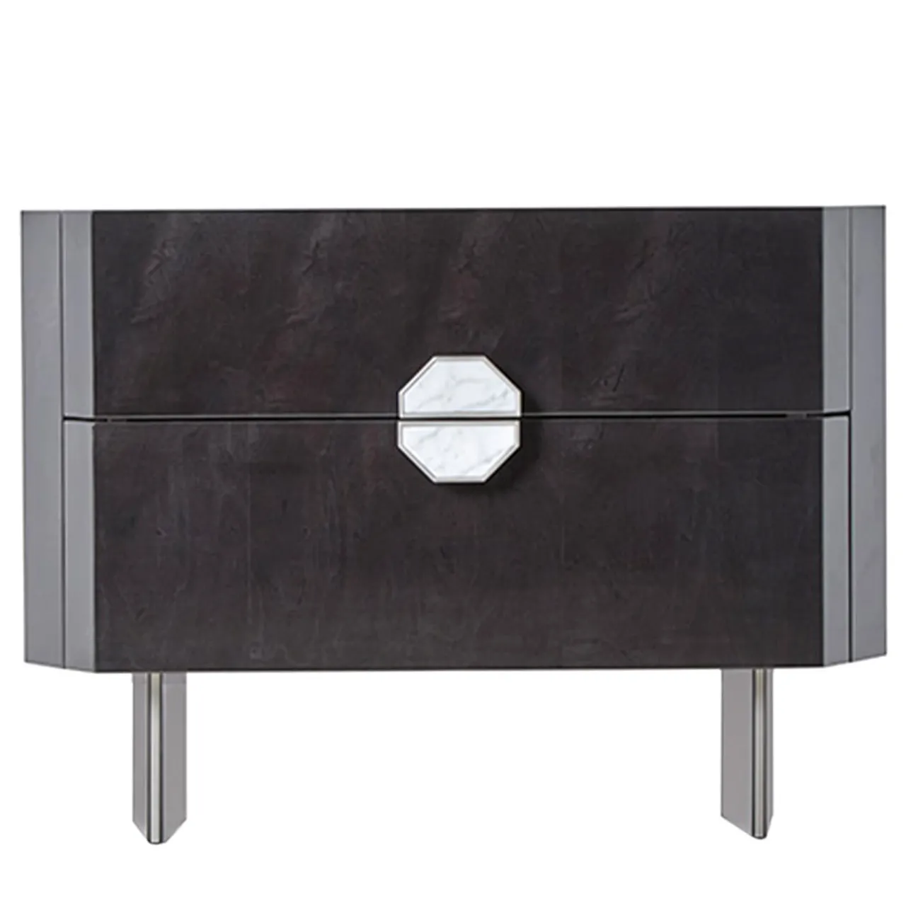 Questa elegante cassettiera a due cassetti ha un piano in marmo, finiture in metallo e gambe laccate. L’apertura è facilitata da una preziosa maniglia in marmo. Caratterizzato dalla finitura lucida Pantera, i dettagli sono realizzati in metallo nichel e marmo di Carrara.