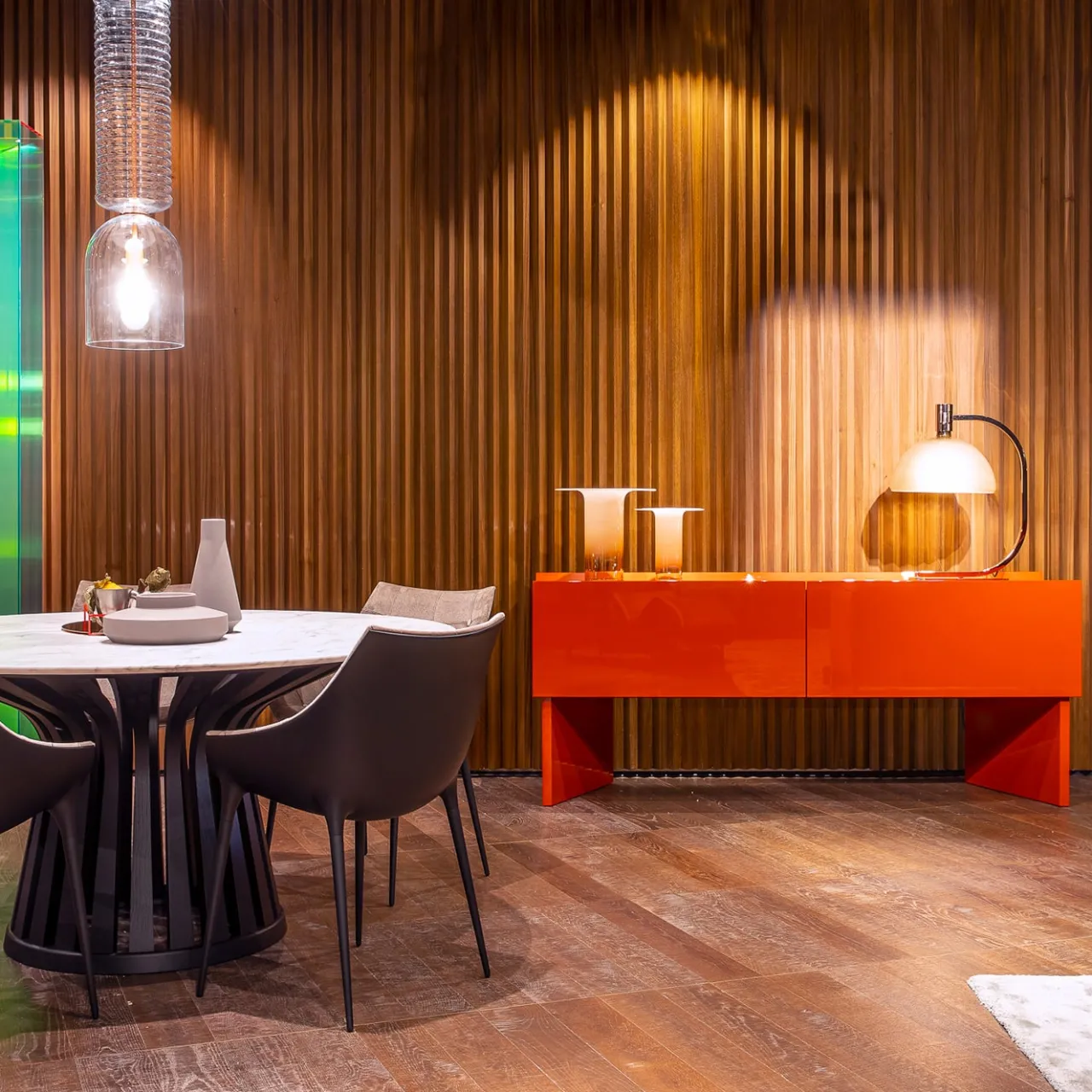 Hayama (2019) – mobile con 2 ante a ribalta laccato lucido, colore rosso Cina (LP 303). Un contenitore dalle linee geometriche e dalla forte influenza giapponese. Come un Haori, tradizionale giacca kimono giapponese, Hayama è caratterizzato dallo stesso taglio formale che gioca con volumi e sottrazioni. Le gambe oblique rispetto alla struttura portante sono l’elemento distintivo di questa credenza essenziale. Apparentemente minimale, la sua forma è accentuata dai bordi assottigliati che diminuiscono la lettura degli spessori. Perfetta per ambienti living e dining, Hayama è dotata di due ante a ribalta e di ripiani in vetro trasparente all’interno. Hayama è disponibile in un’unica dimensione, in laccato lucido in un’ampia scelta di colori. Una reinterpretazione dell’opera dell’architetto Kazuhide Takahama, che ha industrializzato l’antica tradizione della laccatura, esprimendo una chiara volontà di andare oltre il razionalismo attraverso la ricerca di un rapporto con il passato.