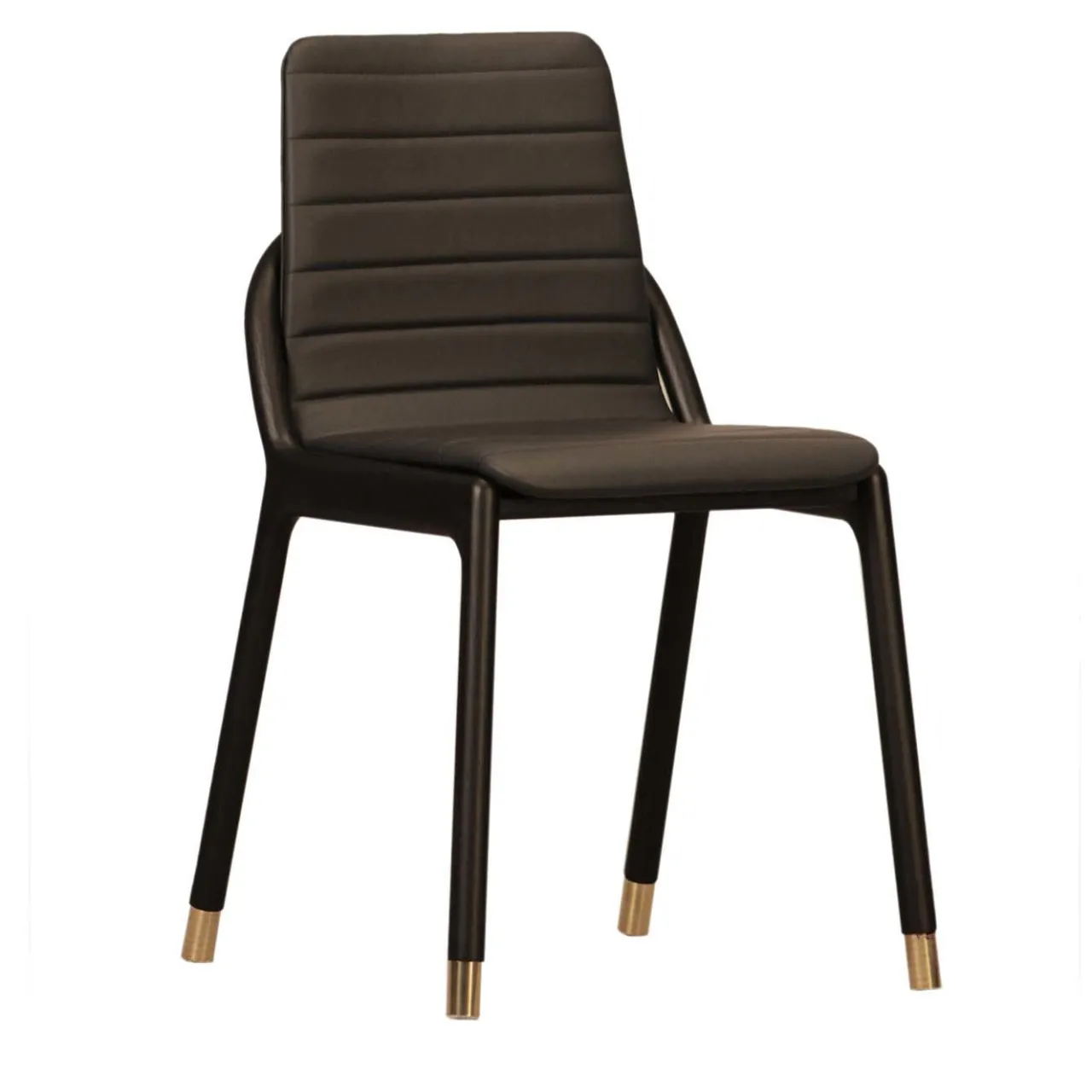Questa sedia è realizzata in legno di frassino e presenta una seduta imbottita in pelle marrone con puntali in ottone. Fa parte della collezione Joyce e abbraccia innovazione e tradizione, cercando di dare forma a oggetti destinati a durare nel tempo. Tutti i pezzi della collezione perseguono i valori di artigianalità e manualità tipici della tradizione ebanistica italiana, esaltando la bellezza del legno massello sagomato, le forme e le sue caratteristiche naturali. Eleganti, sofisticati ma allo stesso tempo passe-partout e versatili, gli arredi della collezione Joyce si adattano a diverse tipologie di ambienti, dai più classici ai più moderni, resistendo nel tempo.