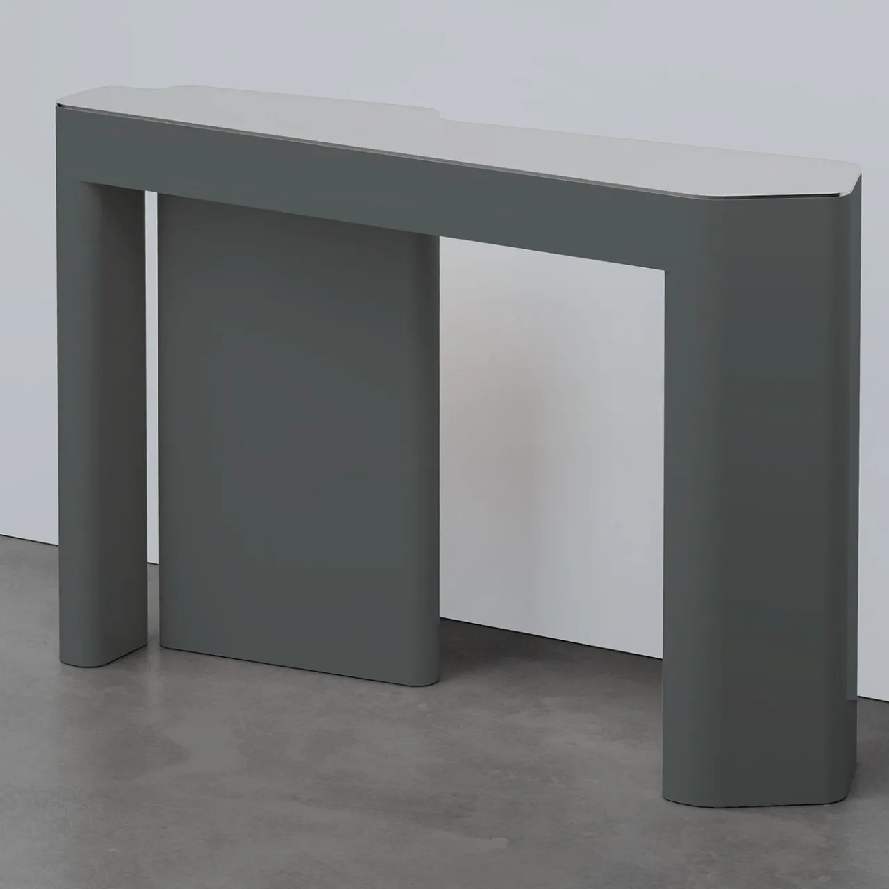 La console Kara, progettata da Artefatto Design Studio, è realizzata in legno laccato lucido color blu cenere. La forma del piano a specchio Extra Clear non solo è accettata, ma è anche abbellita e sviluppata dalle gambe sporgenti che ne apprendono forma e posizione. Il piano e le gambe della console si unificano e agiscono come un’unica parte, creando una console indubbiamente unica.