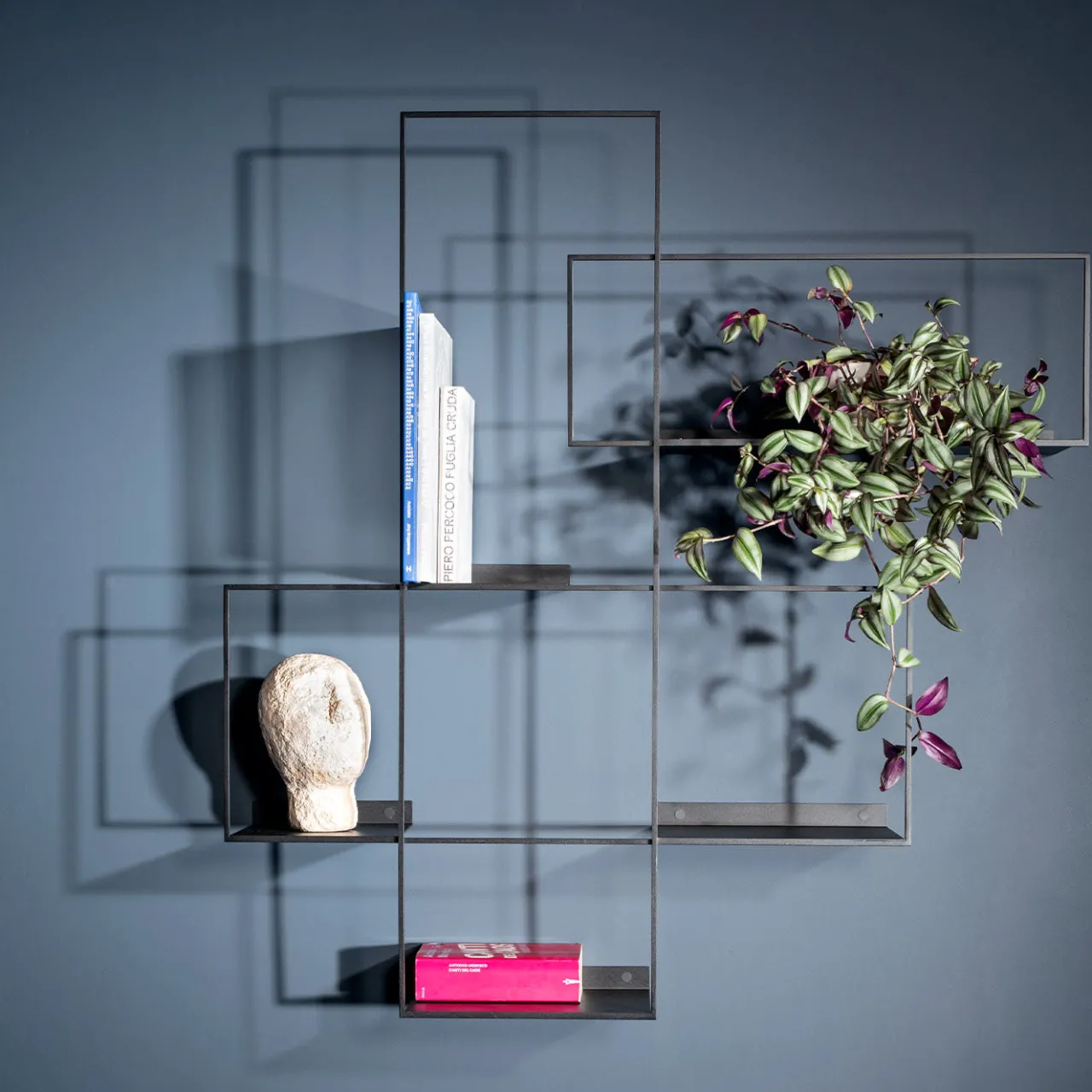 Questo sistema di scaffali modulari presenta un sofisticato design geometrico caratterizzato da rettangoli orizzontali e verticali. Interamente realizzati a mano in elegante acciaio al carbonio con finitura nera, i ripiani misurano 80×20,6×105 cm. Di sicuro impatto negli interni contemporanei, il pezzo può essere abbinato a elementi simili della stessa serie per creare un motivo decorativo a parete unico nel suo genere.