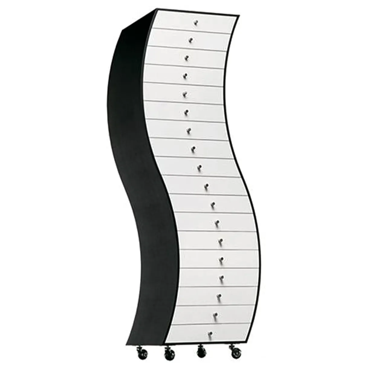 Parte della collezione di cassetti Progetti Compiuti, disegnata per la prima volta da Shiro Kuramata negli anni ’70, il mobile Side 1 è un’aggiunta scultorea agli interni contemporanei. Caratterizzato da una forma sinuosa, presenta una struttura in fibre miste e frassino massiccio ad alta densità ricoperta da uno strato di frassino laccato nero, completata da cassetti bianchi opachi con ruote in acciaio spazzolato e gomma grigia.