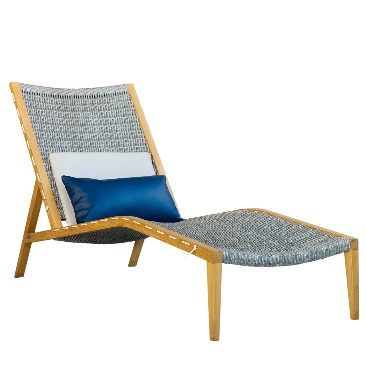 Questo lettino della collezione Regular eleva qualsiasi ambiente esterno con la sua semplice eleganza, dal ponte della piscina al giardino di casa. Incorniciata da una robusta struttura in legno di quercia rifinita a mano con un rivestimento protettivo opaco a base d’acqua, la silhouette curva è caratterizzata da un intreccio fatto a mano in PVC bianco lucido (ordito) e da una corda tecnica in polipropilene blu avio (trama) che corre per tutta la lunghezza del pezzo, offrendo comfort e stile. I cuscini lombari in pelle bianca e blu sono inclusi. Il materiale intrecciato è disponibile in un’ampia gamma di colori; chiedete al Concierge per i dettagli.