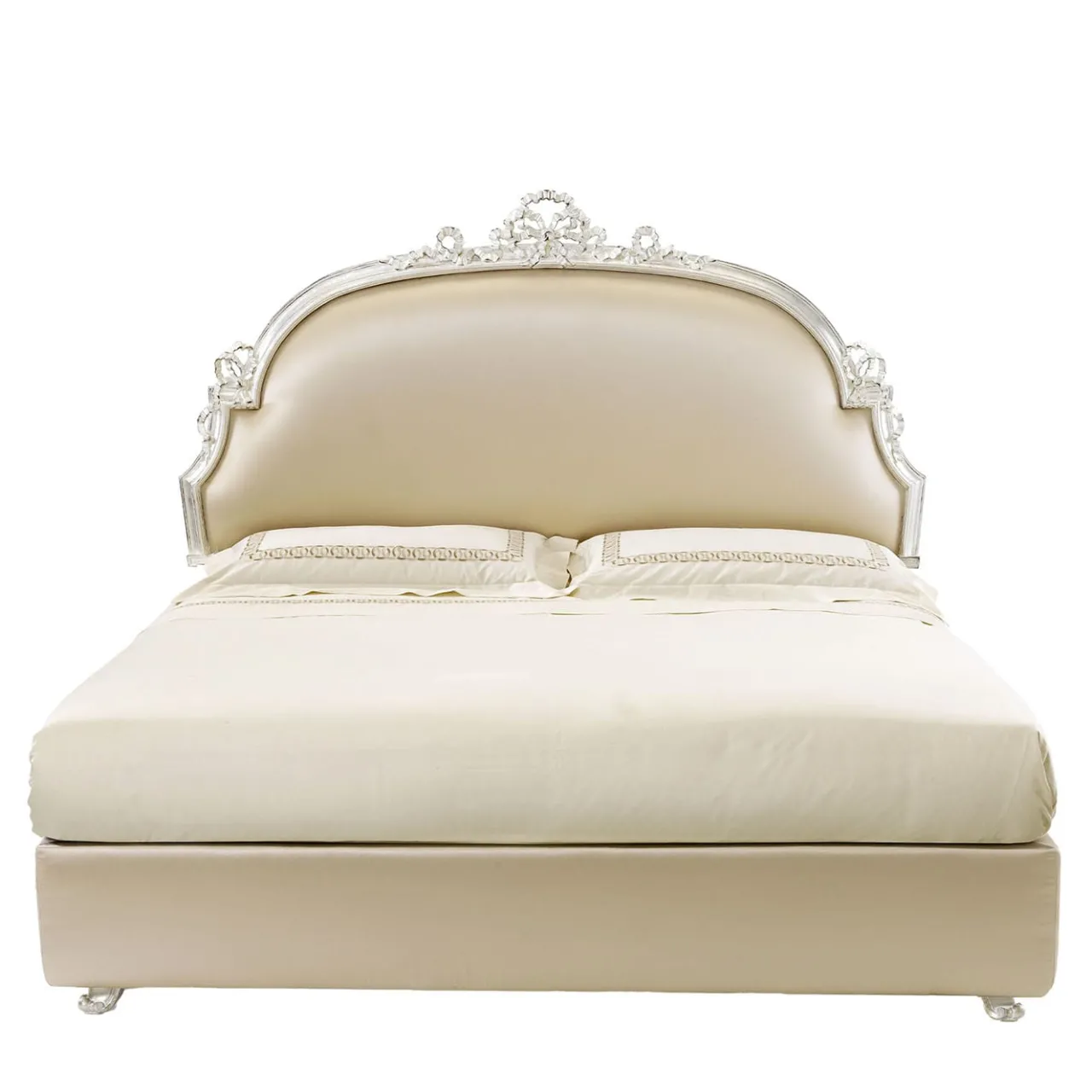 Il letto Fiocco riflette l’eleganza dello stile francese Luigi XVI della fine del XVIII secolo. La testata in legno massiccio intagliato a mano presenta delicati motivi a fiocco e nastro, rifiniti in foglia d’argento patinata (A024 Argento Luce). Il sommier imbottito è dotato di piedini in legno intagliati. Rivestimento in raso di cotone color sabbia, disponibile in altri colori. Adatto a un materasso di 170x200x25 cm (non incluso), disponibile anche in altre misure. Biancheria da letto non inclusa. Contattare il concierge per maggiori informazioni.