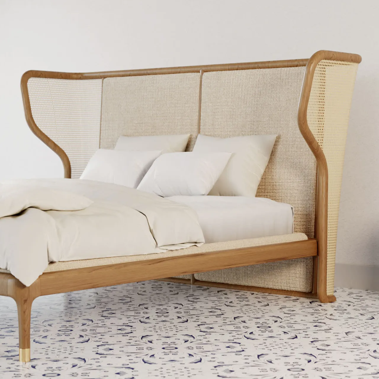 Combinando artigianalità e design senza tempo, questo letto di Libero Rutilo presenta una struttura in legno di frassino e una testata imbottita disponibile in tessuto o pelle. I pannelli laterali, impreziositi da intarsi in paglia di Vienna, conferiscono un tocco di eleganza rustica. Una base a doghe imbottita per una continuità senza soluzione di continuità e gambe in ottone completano il design, rendendolo una scelta raffinata per camere da letto sofisticate. Il materasso non è incluso.