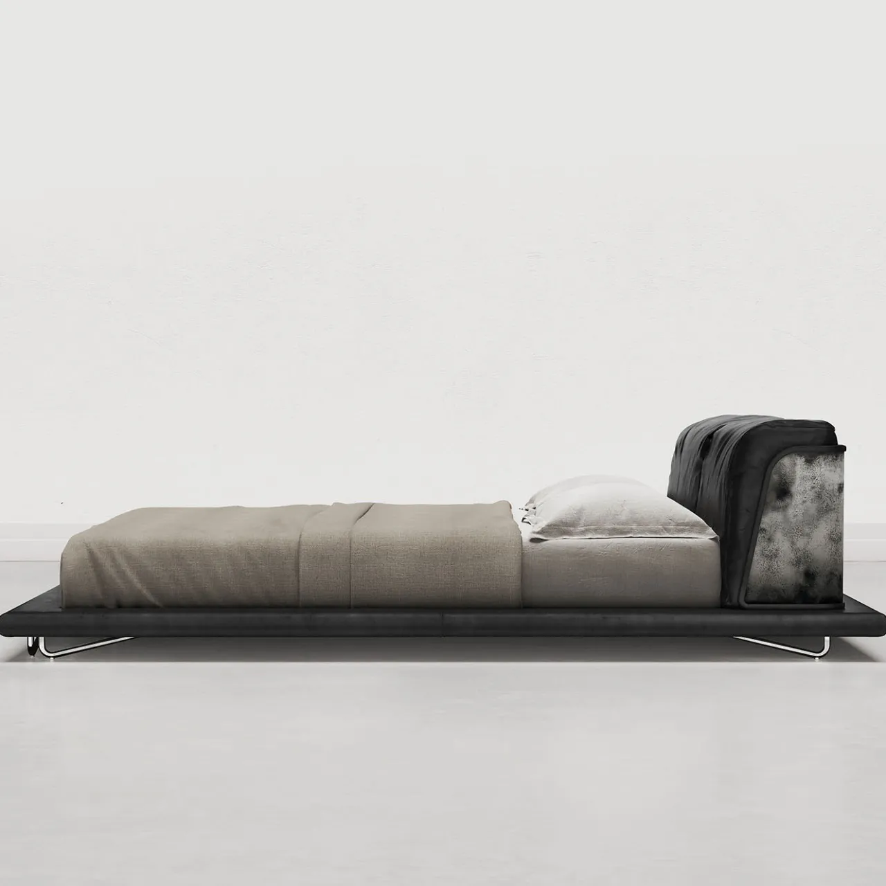 Il letto Saint Germain è rivestito in pelle nera e presenta una struttura in legno con giroletto imbottito a sbalzo sostenuto da piedi in tubolare d’acciaio. La testata comprende cuscini in poliuretano espanso e misto piuma d’oca, racchiusi in un guscio di legno rivestito in acciaio. Il letto è dotato di una rete a doghe in legno. Le finiture in ottone spazzolato nero e argento grezzo aggiungono raffinatezza, con dimensioni e finiture personalizzate disponibili su richiesta. I cuscini non sono inclusi.