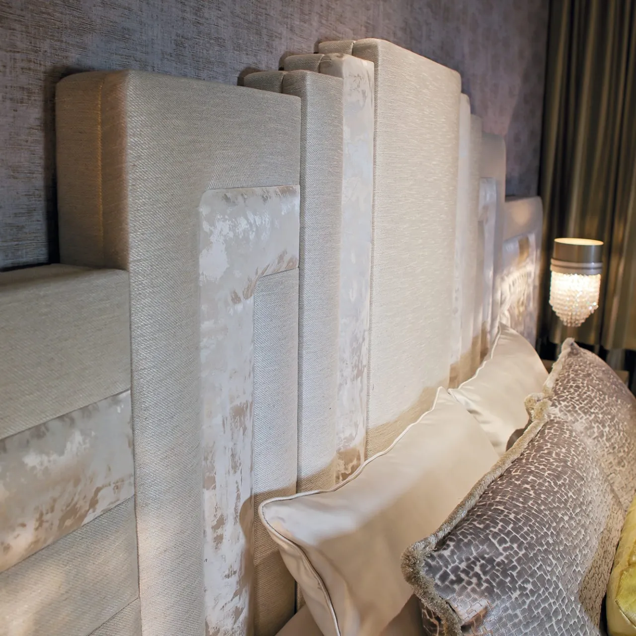 Letto della collezione Hanami. Struttura in legno imbottita. Testata con due tessuti diversi, giroletto in ecopelle. Base in raso oro. È inclusa solo la struttura del letto. Chiedere al concierge per le opzioni di personalizzazione.