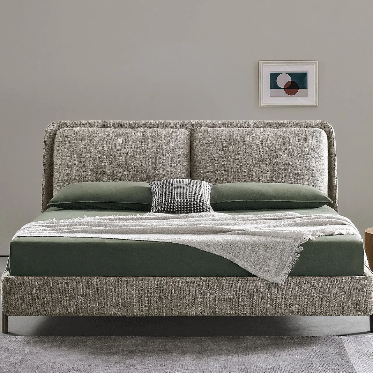 Letto con struttura in legno imbottita in schiuma di poliuretano, completata da una base a doghe in metallo con inserti in faggio. La struttura è fissa, priva di contenitore, e poggia su piedini in metallo con finitura bronzo. La testiera è arricchita da due cuscini removibili, fissati tramite Velcro. L’intero letto è rivestito in tessuto San Diego col. 96. Materasso escluso. Rivestimento non sfoderabile.Per dimensioni e opzioni di rivestimento alternative si prega di contattare il Concierge