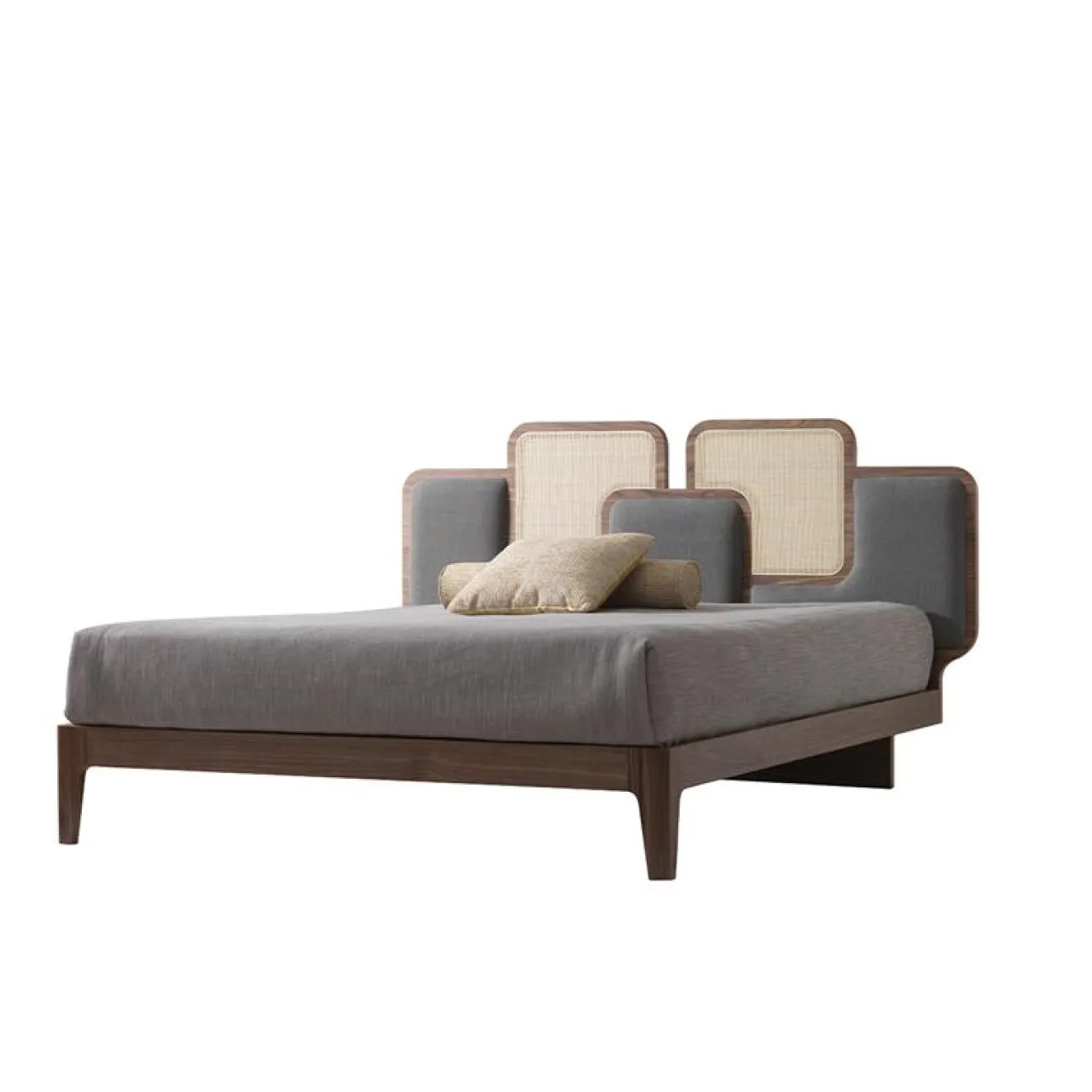 Realizzato in lussuoso noce canaletto, il letto Nuvola presenta un’originale testata con tre cuscini imbottiti e due cuscini in rattan naturale che creano un perfetto equilibrio di texture. Progettato per un materasso king size (195×205 cm), il letto è dotato di una rete a doghe per il sostegno. Un raffinato mix di materiali naturali e design contemporaneo, che aggiunge sobria eleganza a qualsiasi spazio. Il materasso non è incluso, si prega di contattare il Concierge per maggiori dettagli.