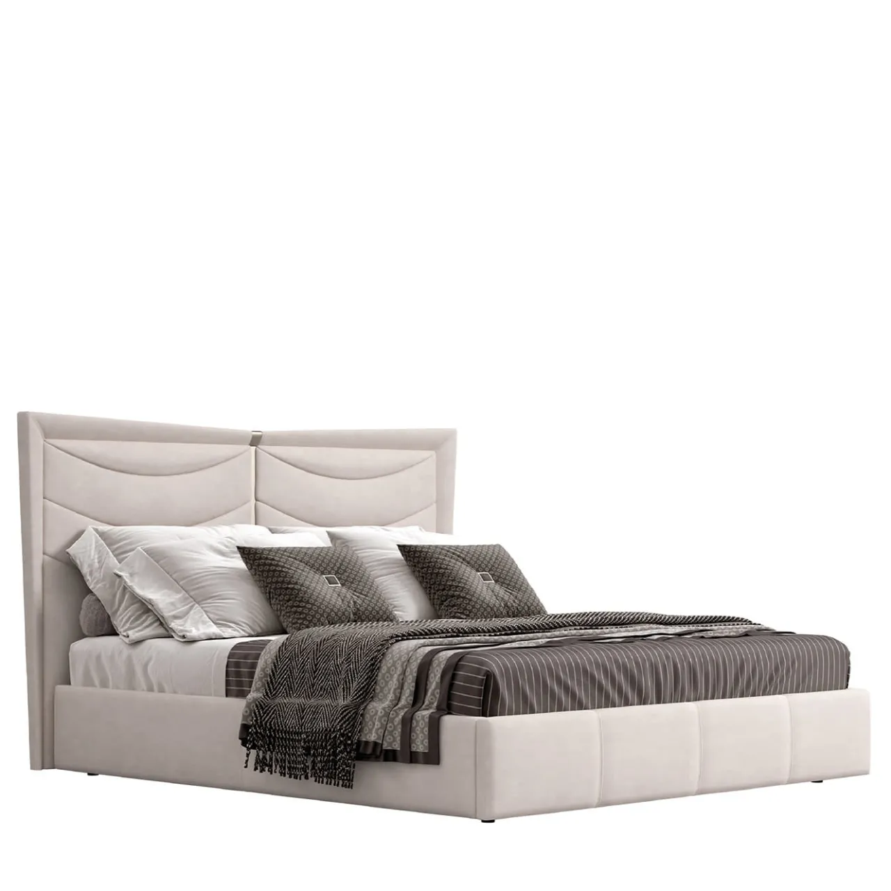 La raffinatezza sartoriale trasuda da questo raffinato letto matrimoniale, la cui silhouette è definita da un sapiente equilibrio tra linee dinamiche e tonalità delicate. Gli inserti metallici aggiungono luminosità al rivestimento in tessuto beige, ornato da un motivo di curve trapuntate sulla testata. La rete è inclusa, mentre il materasso, la biancheria e i cuscini non sono inclusi. Per la variante in pelle, rivolgersi al Concierge.