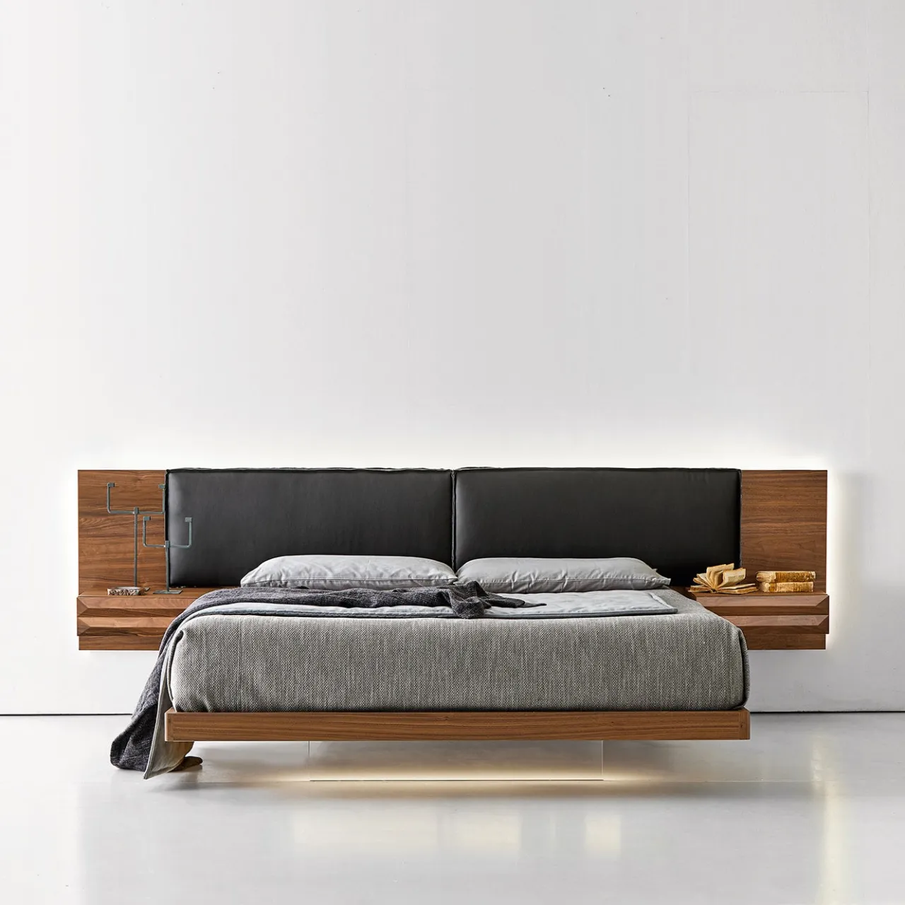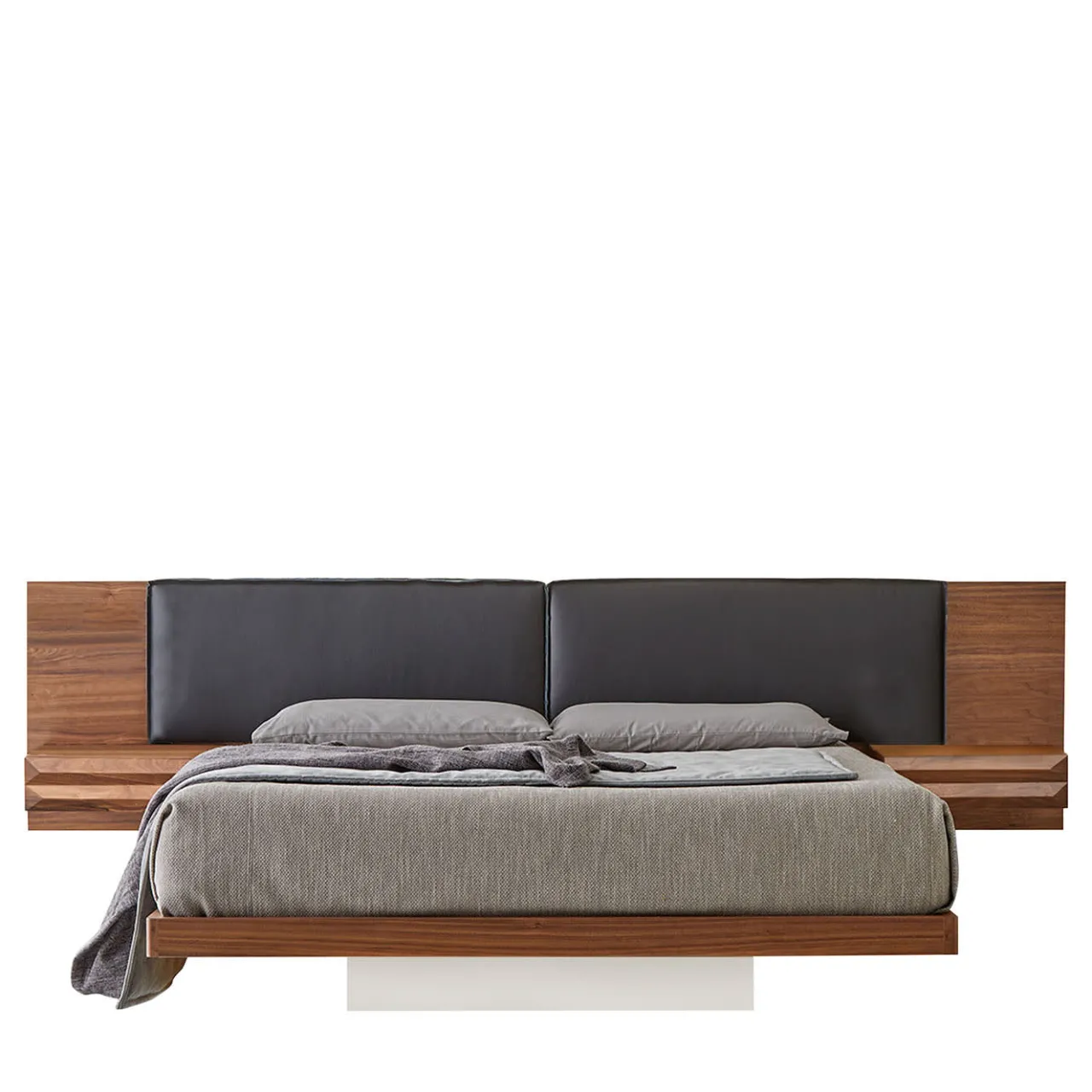 Il letto York Soft è caratterizzato da una testata interamente in legno di noce canaletto con cuscini rivestiti in pelle nera. È sostenuto da un piede in vetro temperato e dotato di una coppia di comodini in legno con cassetti a chiusura ammortizzata con maniglie incassate. Nel prezzo è compresa l’illuminazione a LED per la testata e il piede in vetro con possibilità di accensione tramite app o telecomando. La testiera deve essere fissata alla parete con uno speciale sistema di fissaggio fornito dall’azienda. La rete, il materasso e i cuscini non sono inclusi. Chiedere al Concierge per le opzioni di personalizzazione.