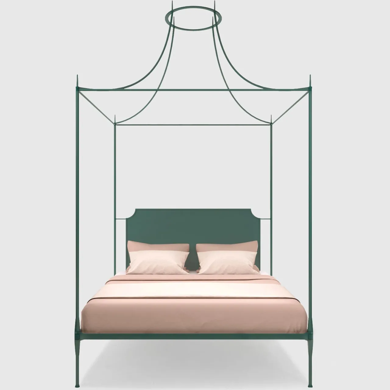 Solenne e contemporaneo. Un baldacchino dalle dimensioni importanti che riflette la storia e le tradizioni della forgiatura, come risultato delle diverse tecniche utilizzate per la sua creazione. Una solida struttura in ferro trafilato, con gambe tonde, montanti e puntali forgiati a mano. La testata è in lamiera insonorizzata con bordi in ferro a mezza mandorla. La rete è inclusa. Il materasso non è incluso.