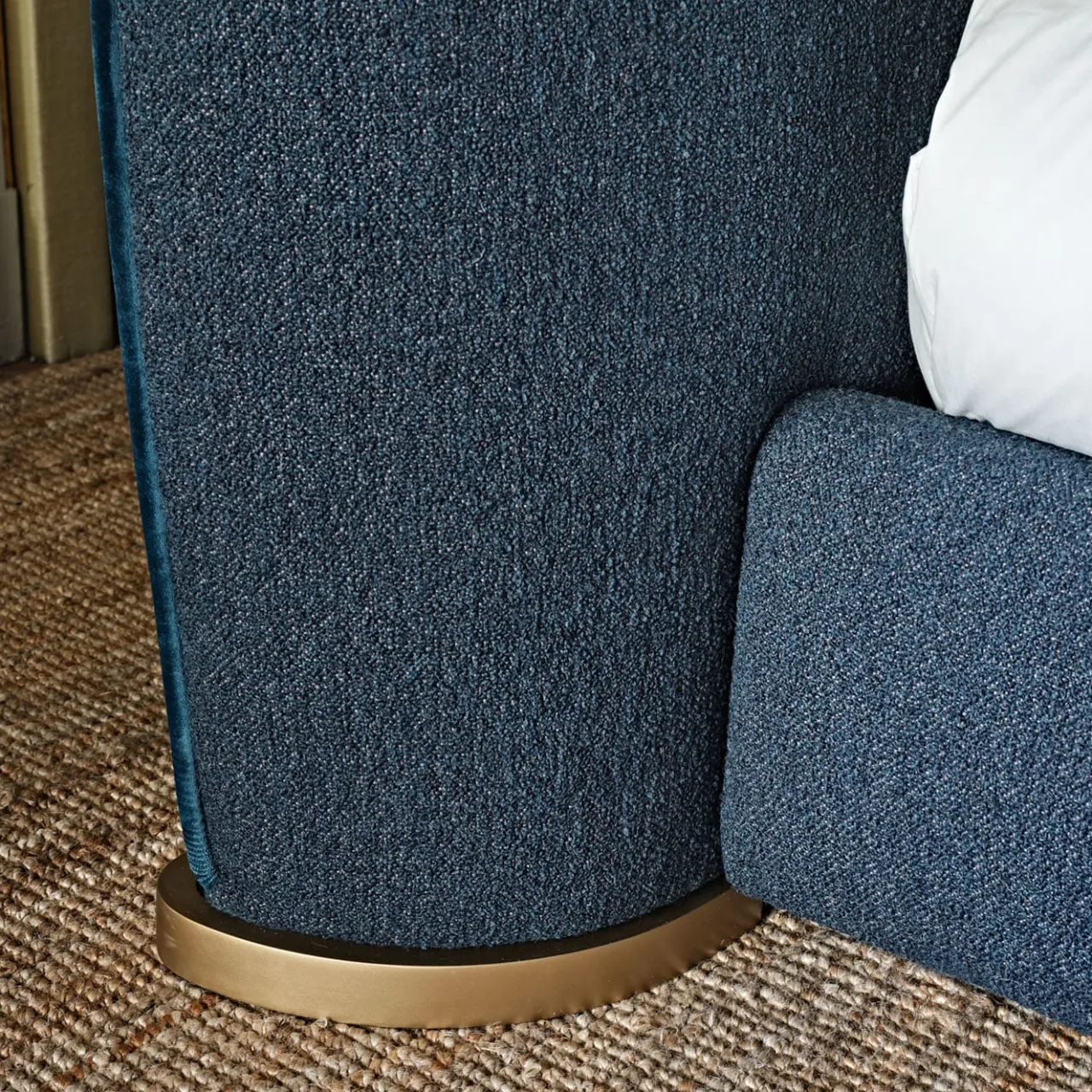 Letto con testata e giroletto in legno di pioppo, imbottitura in poliuretano espanso ad alta densità, rivestimento in fibra termolegata con jersey elasticizzato. Dettagli in legno color oro opaco. Rete a doghe in legno con regolatori di rigidità. Dimensioni materasso 180×200. Completamente sfoderabile solo in tessuto.