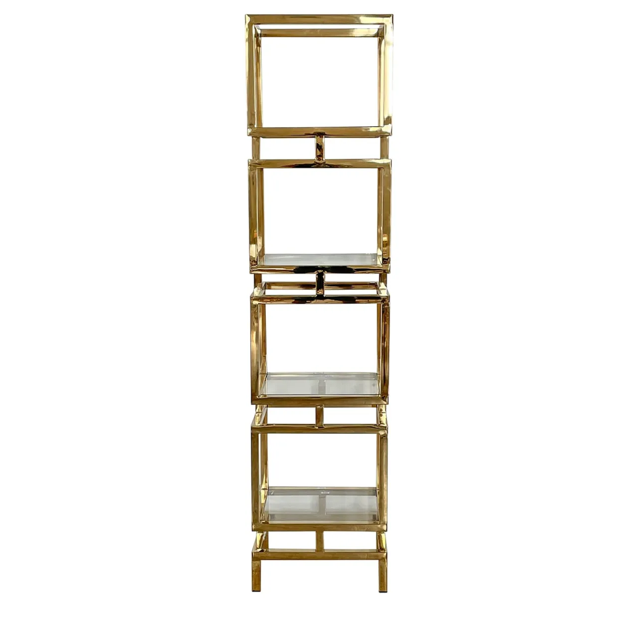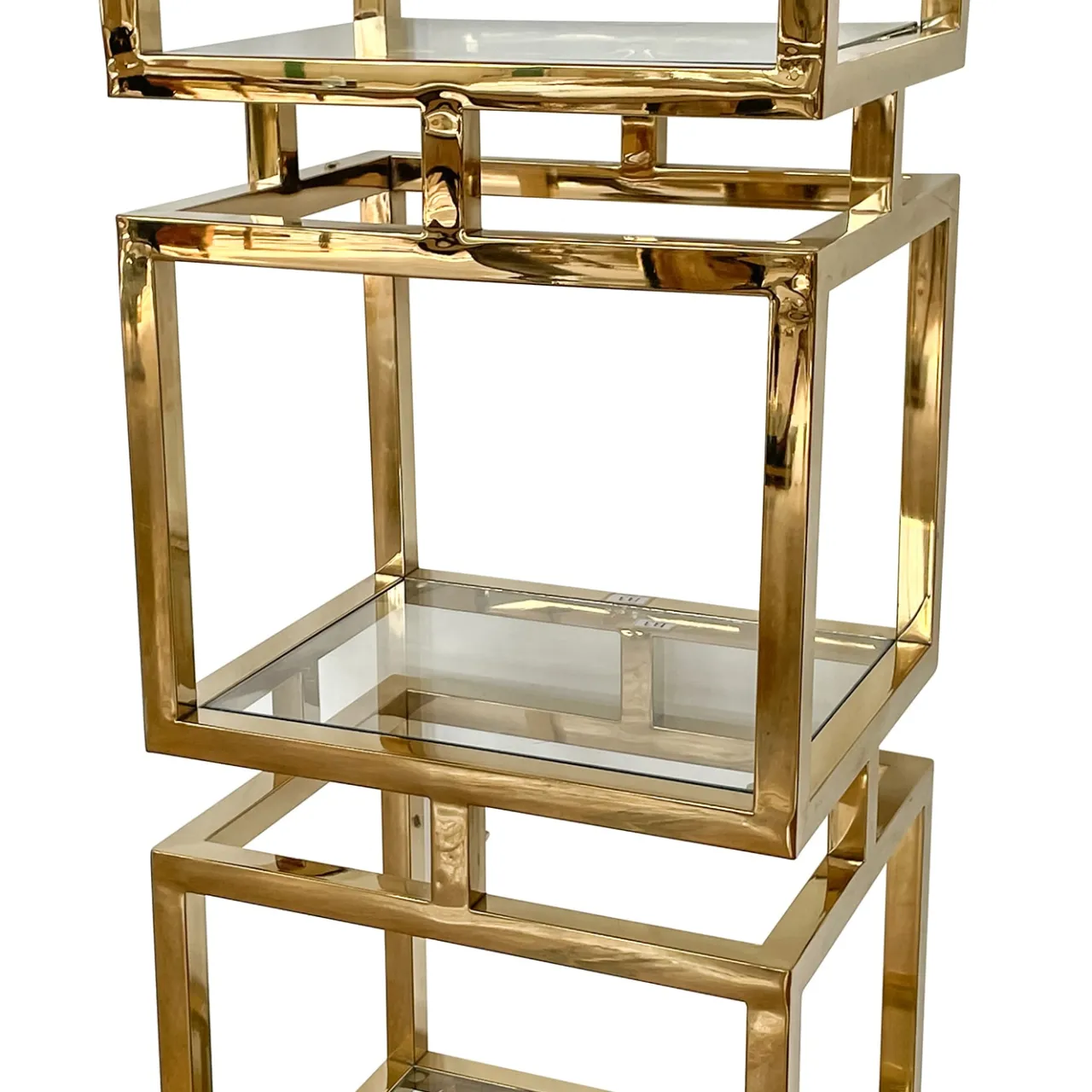 Con un’allure totemica e gioiello, questa libreria cattura l’attenzione per il suo impatto lussuoso e altamente decorativo. I quattro ripiani in vetro sono incastonati in blocchi parallelepipedi impilati che compongono la struttura in ottone dorato, il cui design a colonna la rende una soluzione ideale per adattarsi a spazi ridotti. Elegante e versatile, è un pezzo perfetto per raccogliere libri e oggetti da collezione.