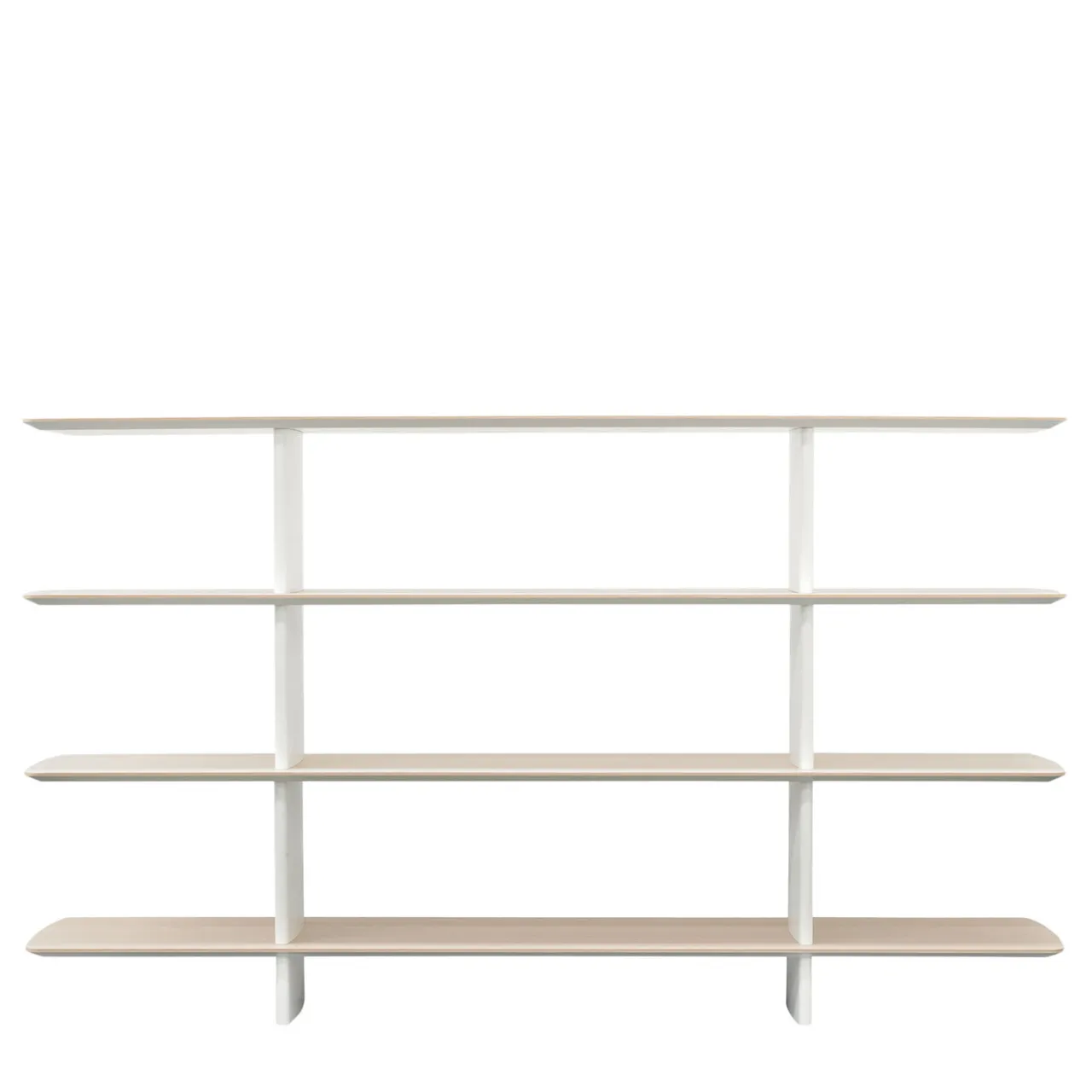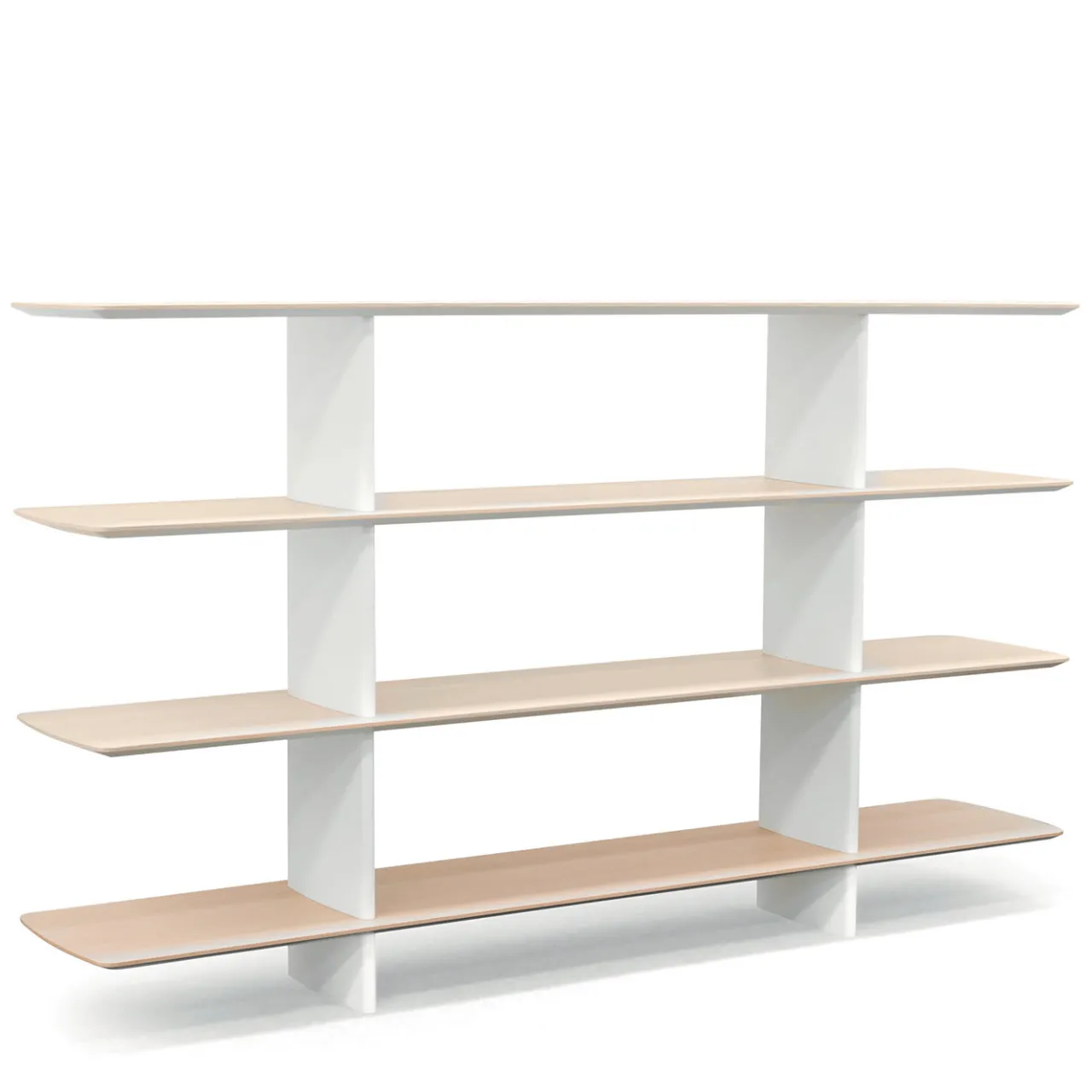 La predilezione per le linee morbide e i volumi armoniosi si riflette nell’estetica delicata di questa libreria. Disponibile anche in altre varianti, presenta uno scheletro in alluminio verniciato in bianco che funge da supporto per i quattro ripiani in rovere leggero con angoli smussati. La base, morbidamente sagomata, è realizzata in Cristalplant® bianco opaco, un materiale sostenibile apprezzato in tutto il mondo per la sua resistenza, flessibilità e morbidezza al tatto.