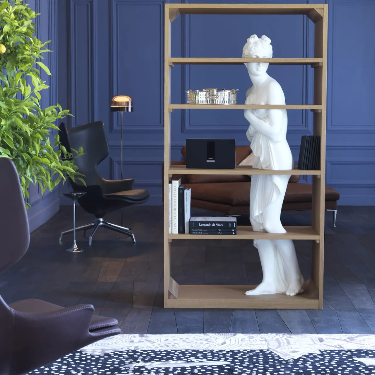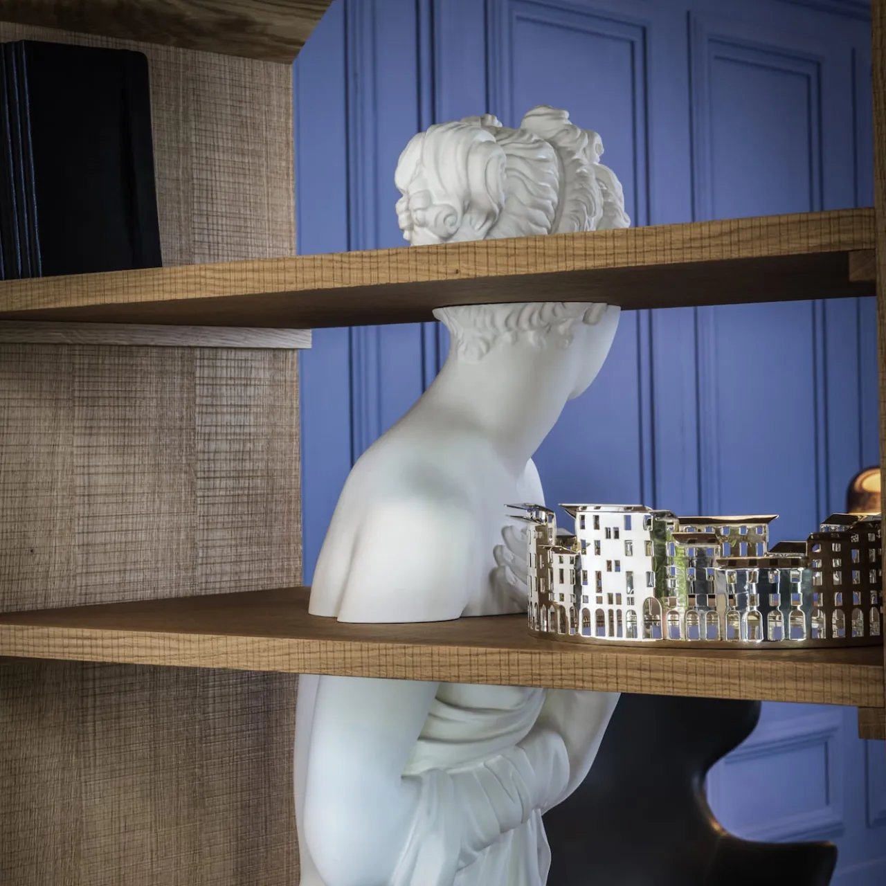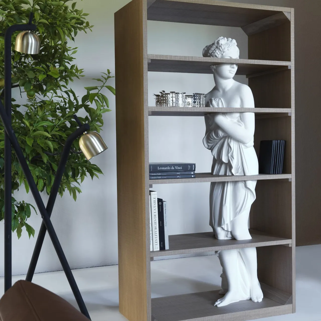 La minuta riproduzione di un’antica statua femminile che attraversa quattro diversi ripiani descrive il design sorprendente ed eclettico di questa libreria. Riflettendo la personalità artistica del suo designer, è caratterizzata da una struttura in legno duro dalle linee pulite che fa da contraltare alla maestosità della statua in marmo bianco. Un vero e proprio pezzo forte per gli arredamenti contemporanei.