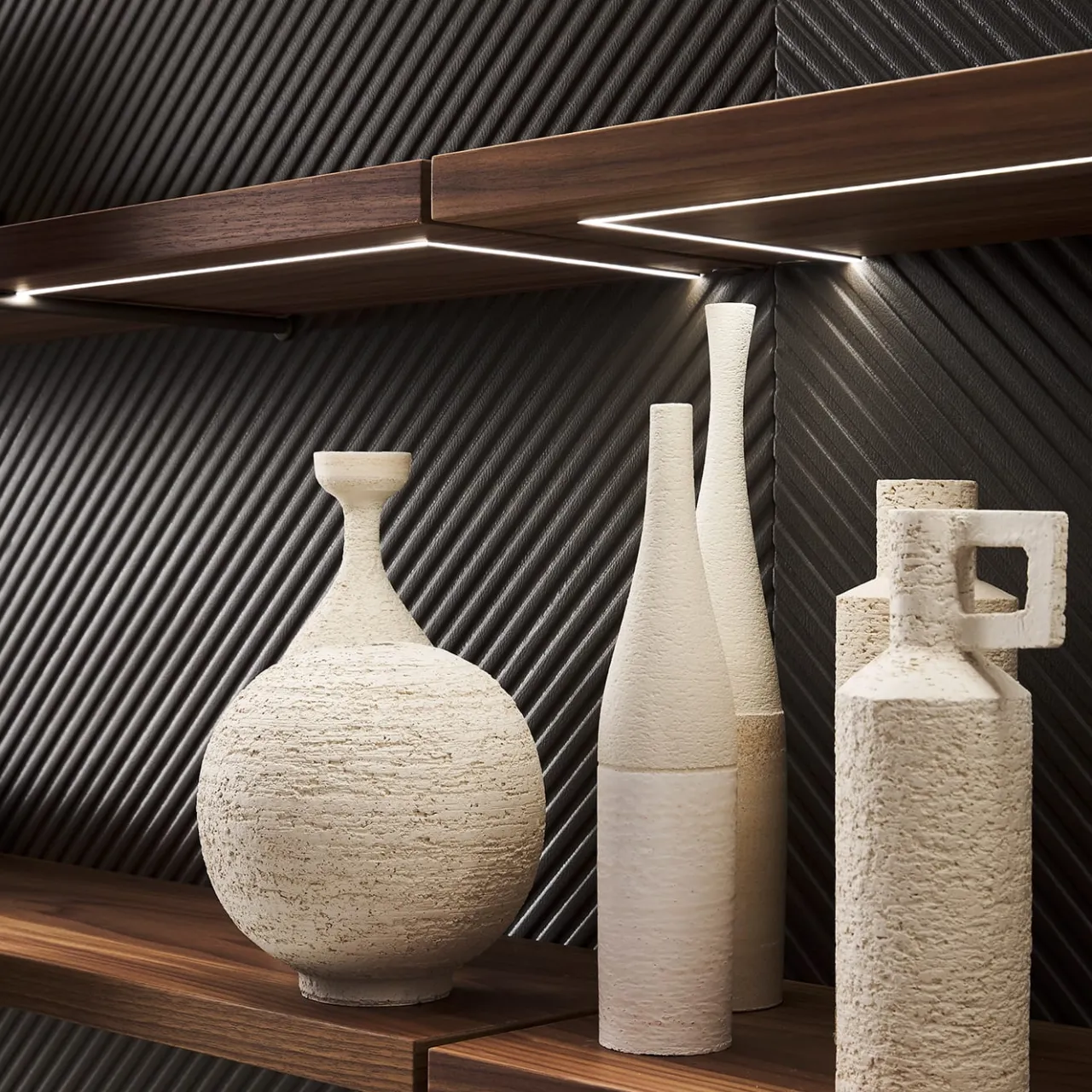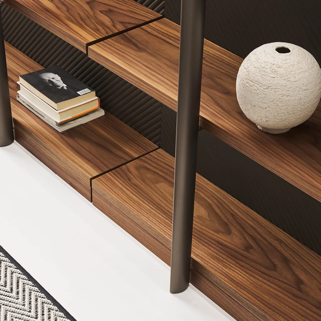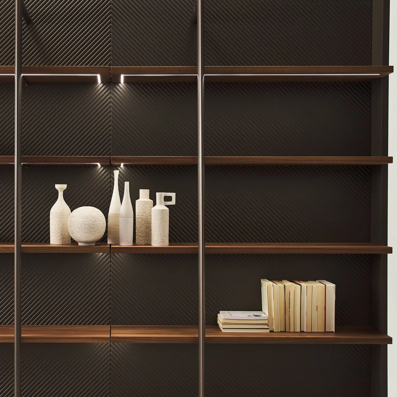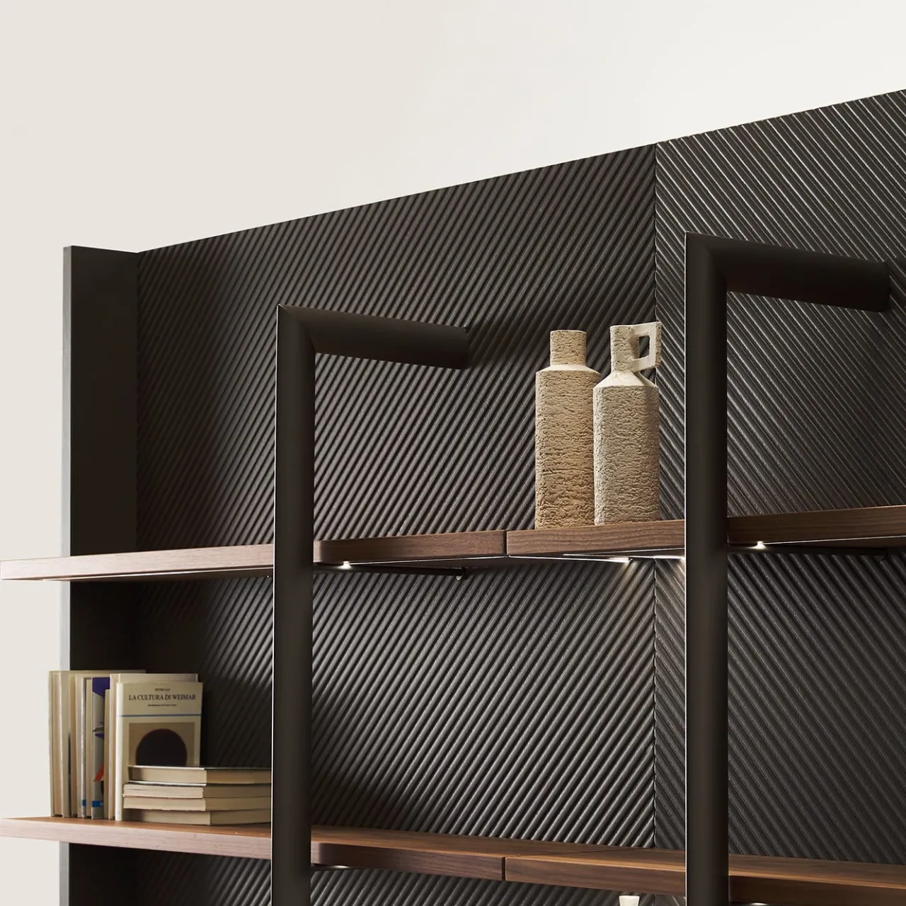 Design di seducente impatto sartoriale, questa libreria cattura immediatamente lo sguardo grazie agli accenti in ecopelle nera, impreziositi da una texture a creste diagonali. La struttura è costituita da barre di metallo verniciato scuro, che interagiscono ortogonalmente con i sei ripiani a nido d’ape in legno caldo. Per informazioni sulla versione con illuminazione LED touch-sensor, rivolgersi alla Concierge. Per informazioni sulla variante con illuminazione a LED, rivolgersi al Concierge.