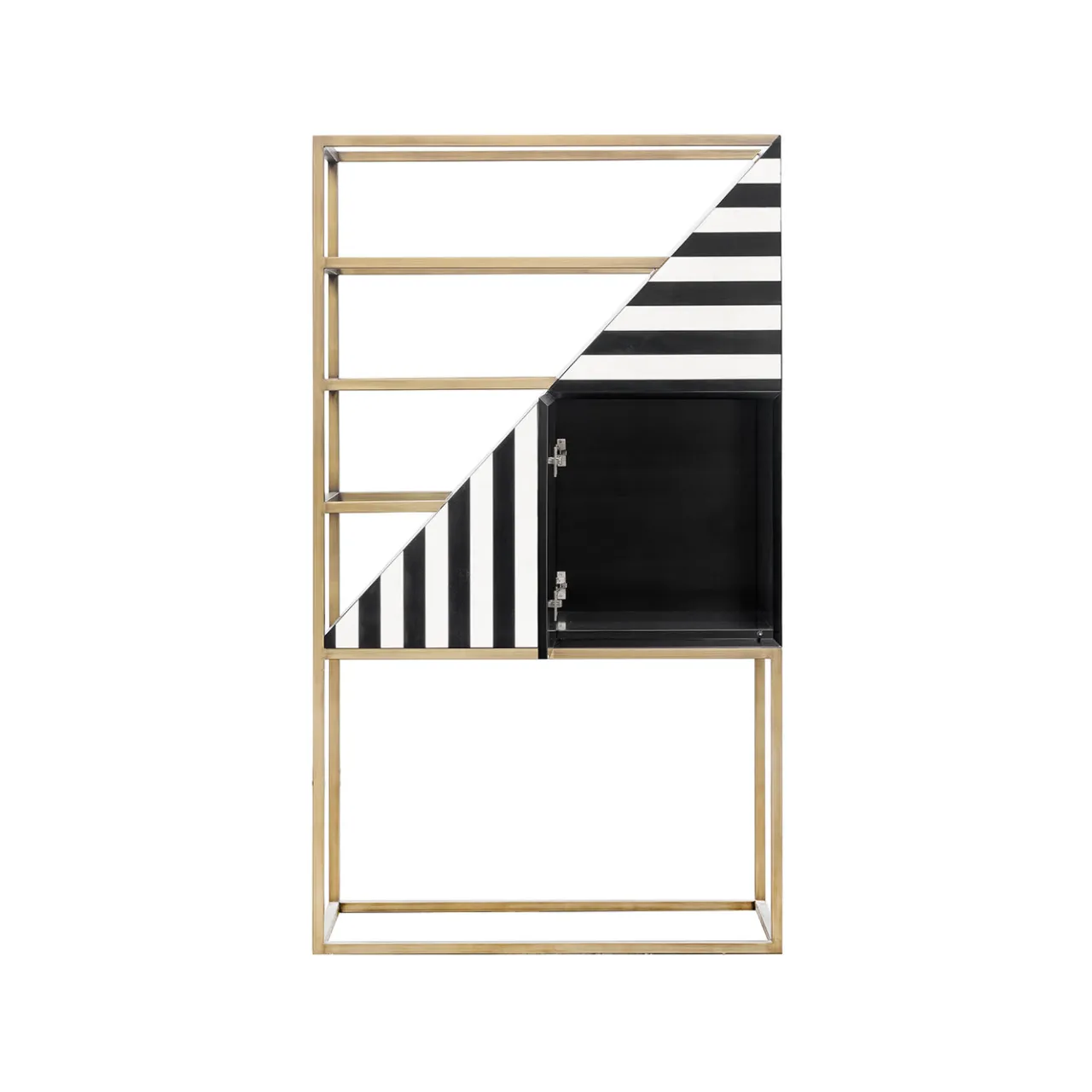 Questa singolare libreria, che fonde design e funzionalità, ha un design bifacciale che le permette di essere utilizzata come divisorio indipendente in interni in stile loft o di essere collocata contro una parete spoglia come punto focale artistico. Un esercizio di geometria visiva, questa libreria comprende elementi aperti e chiusi. Caratterizzata da ripiani in cristallo, la sottile struttura metallica è rifinita in ottone spazzolato per creare un contrasto cromatico con l’intarsio a spina di pesce realizzato a mano in legno di pero bianco e nero che orna i sei pannelli delle ante. Personalizzazione disponibile su richiesta.