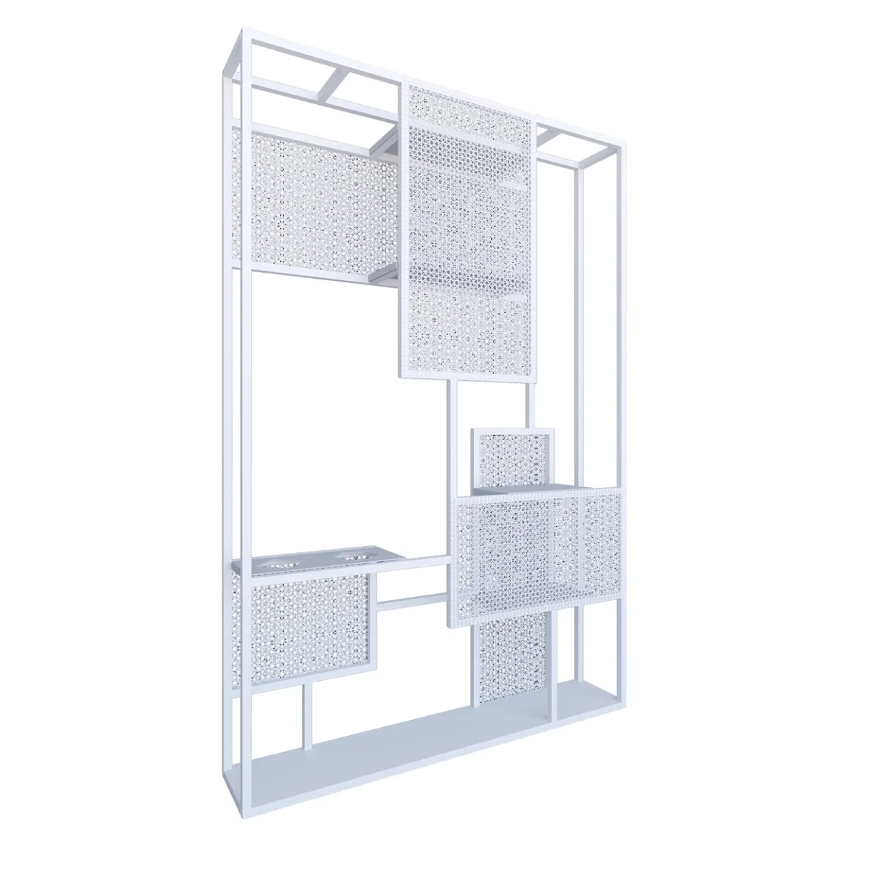 Libreria e divisorio in ferro e i-Mesh®, Aria separa senza chiudere, muove e organizza gli ambienti lasciandoli in comunicazione tra loro. È un innovativo pezzo personalizzabile di artigianato made in Italy utile per ospitare oggetti ed esporli. Leggero, essenziale, elegante, scenografico e funzionale. Luminoso nella versione proposta total white, è composto dalla struttura in ferro laccato bianco lucido e dai pannelli in fibra di vetro i-Mesh, bianchi per natura.