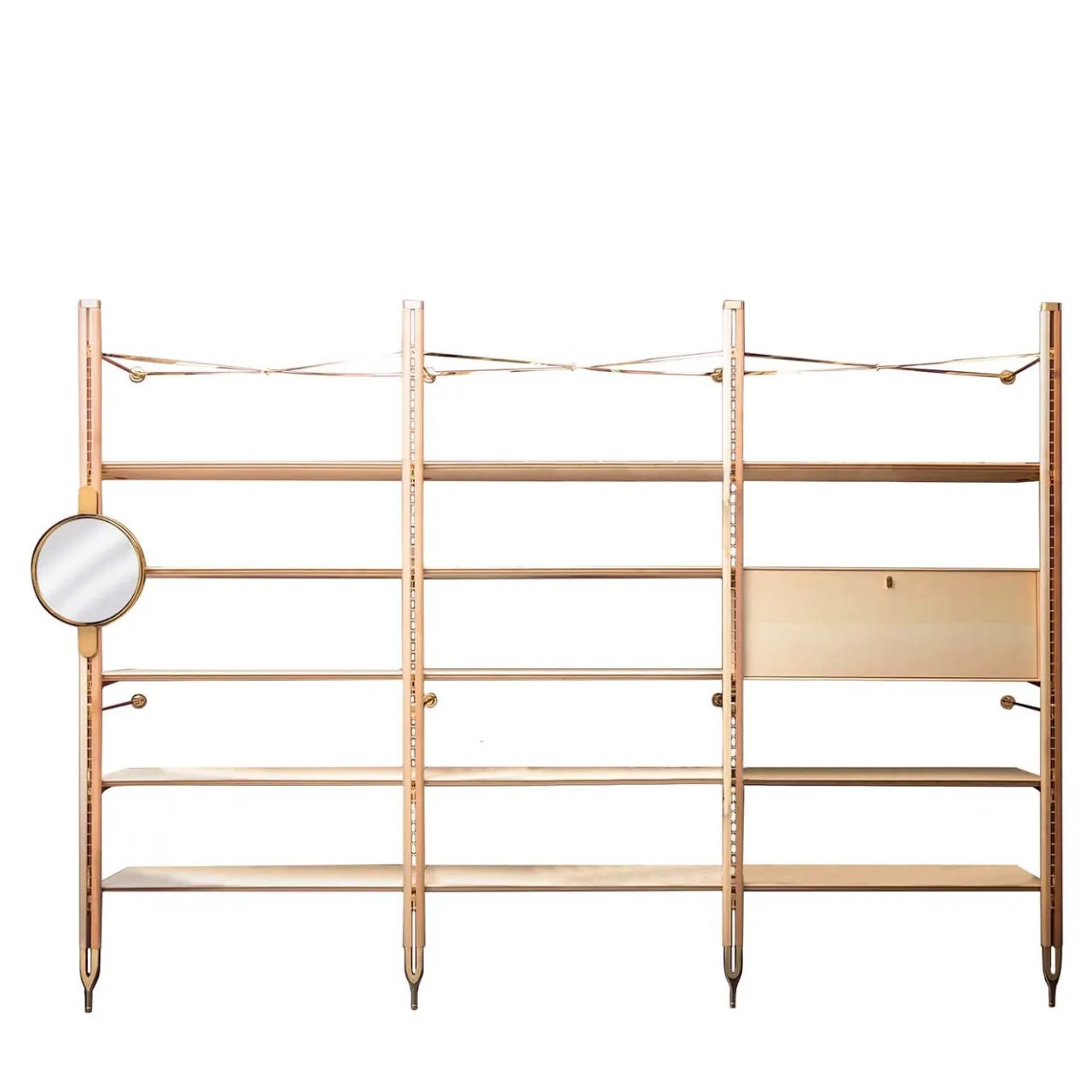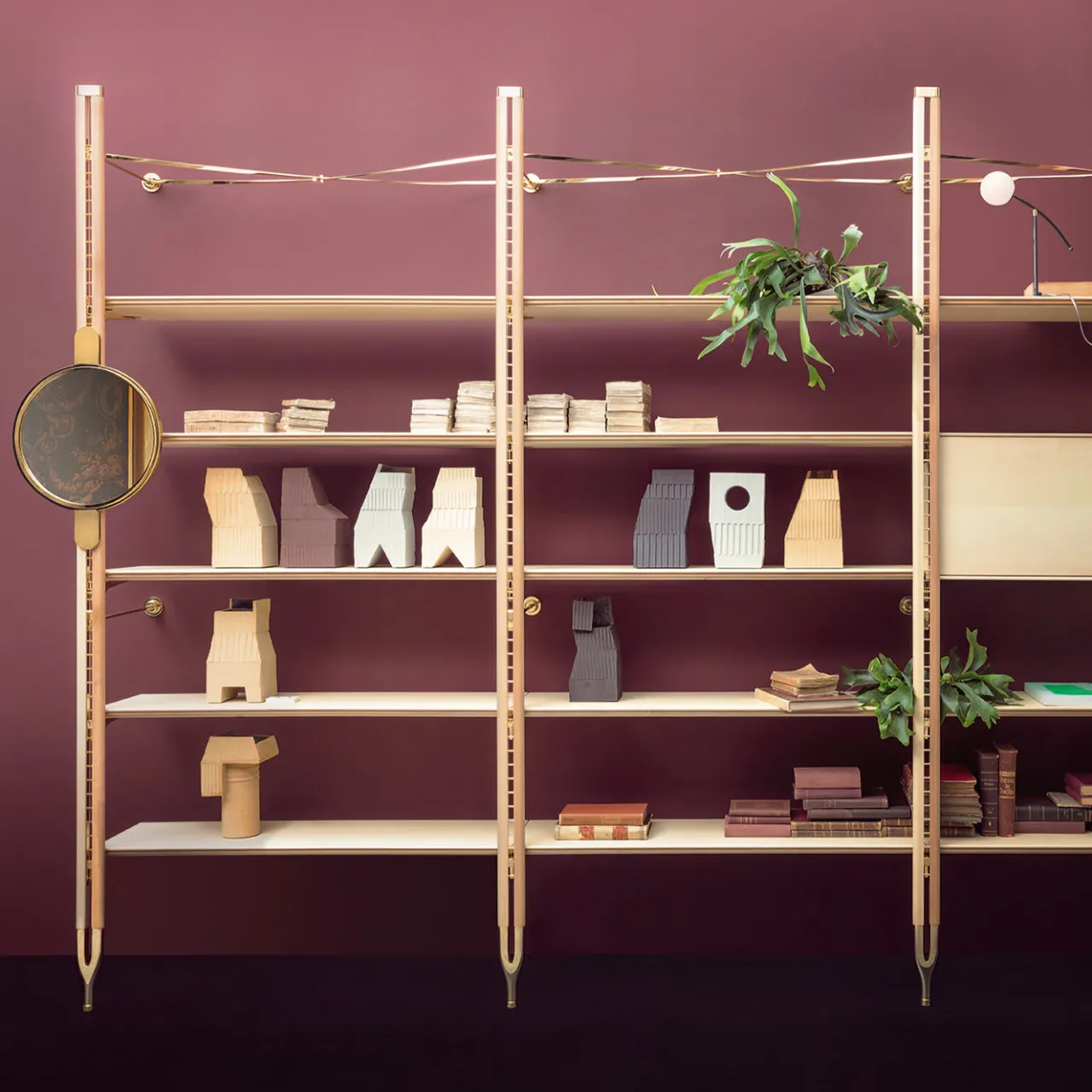 Disegnata da Paolo Cappello, questa libreria modulare è un omaggio moderno e sofisticato alla struttura frattale. Combina armoniosamente moduli lunghi 120 cm per creare infinite combinazioni di vani aperti per esporre e contenere una varietà di oggetti, a seconda dell’uso. Ogni libreria è personalizzabile e si possono aggiungere elementi diversi per ogni esigenza di arredamento. In questo caso, la struttura in ottone lucido sostiene ripiani in acero e faggio, con l’aggiunta di un modulo chiuso (120 x 35 x H43 cm) e di uno specchio rotondo (42,5 x 1,6 x H64,5 cm).