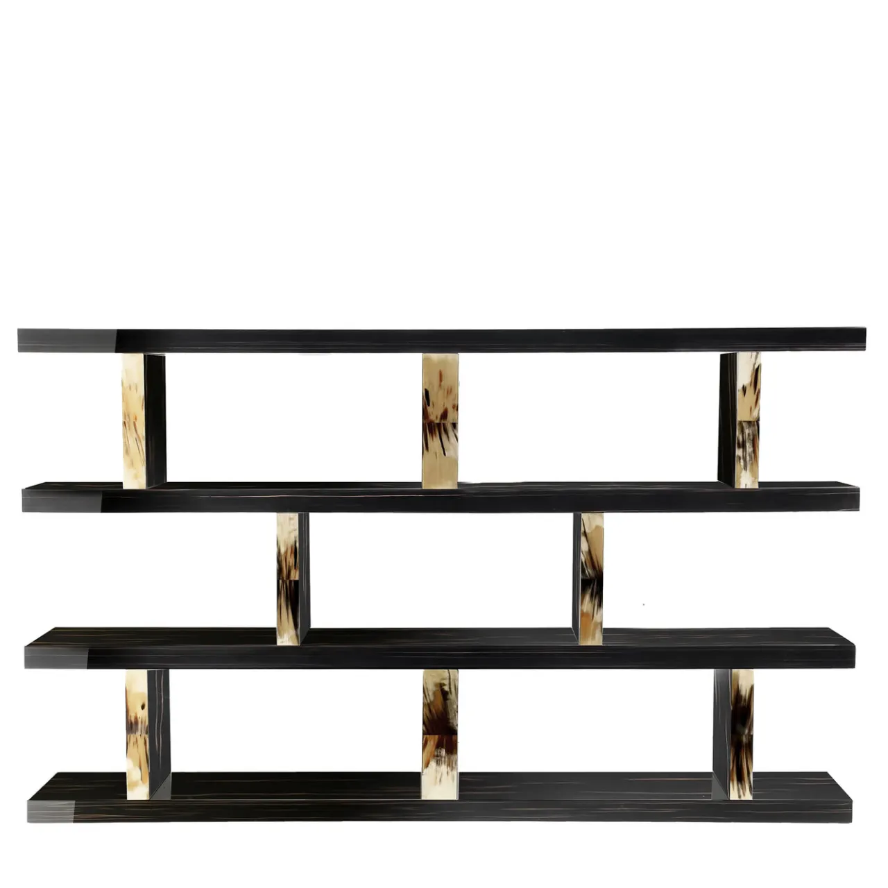 Ispirata all’architettura “pelle e ossa” di Mies, la struttura minimale di questa libreria a giorno crea un senso di spazio aperto, libero e senza ostacoli, mettendo in risalto la bellezza naturale dell’ebano lucido che si erge in linea verticale su cornici di corno a contrasto. Progettata per contenere libri, foto e oggetti d’arte, questa superba libreria ha quattro ripiani intersecati da otto elementi in corno disposti in modo sfalsato. Questo pezzo accattivante aggiungerà un effetto grafico e dividerà gli ambienti con eleganza.