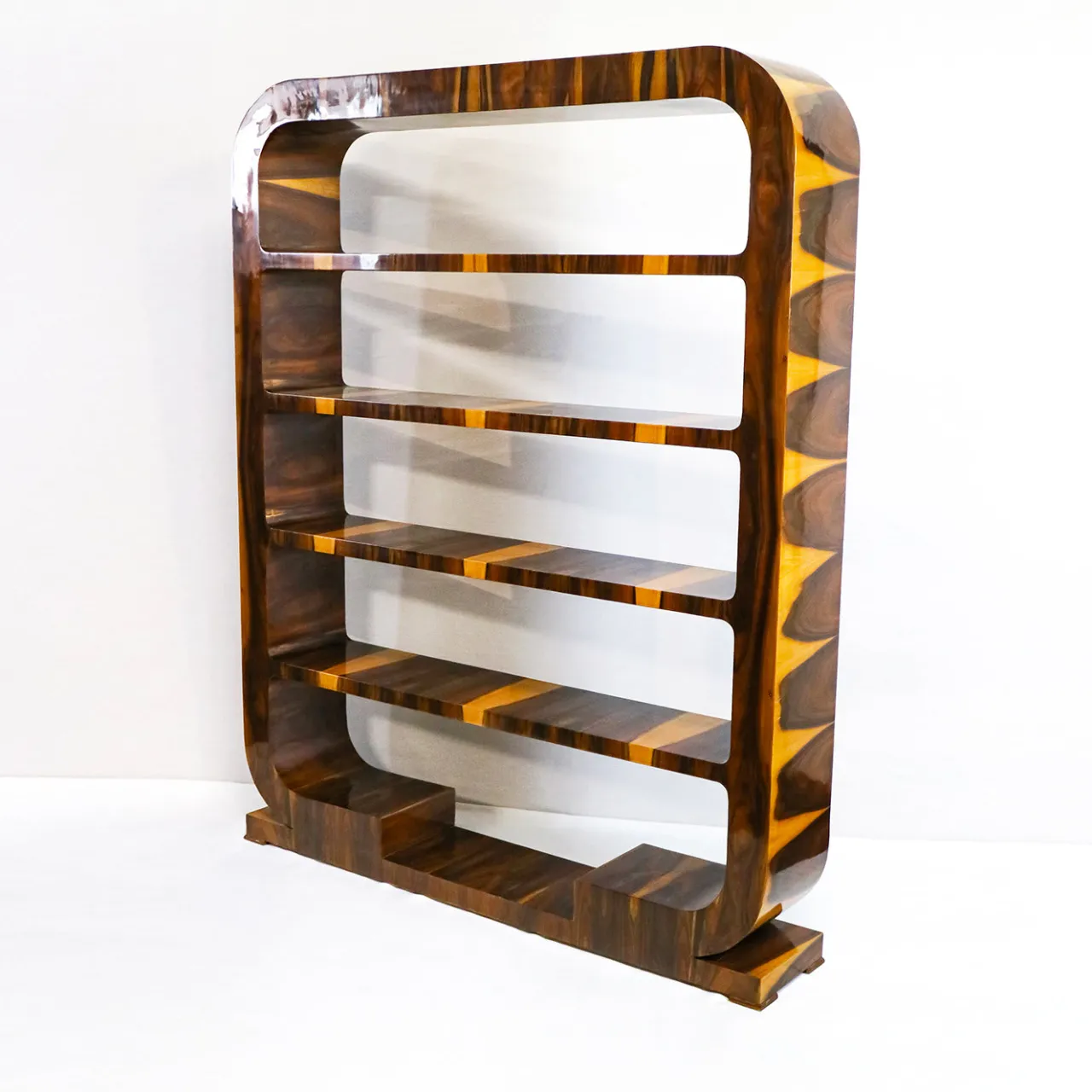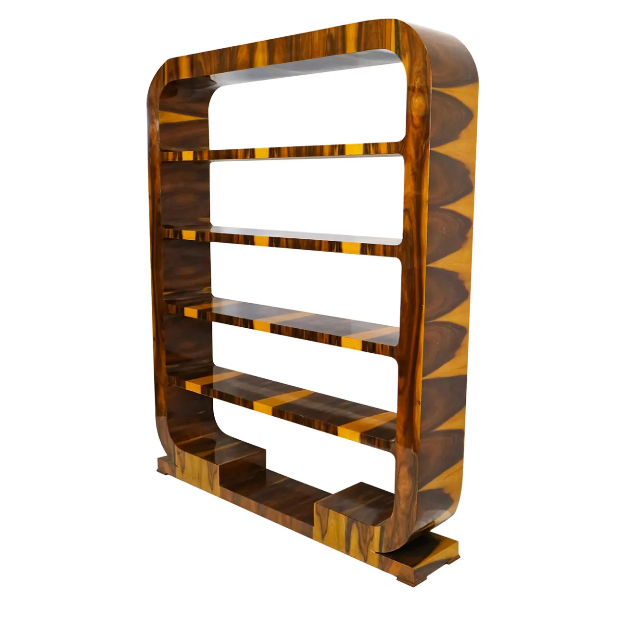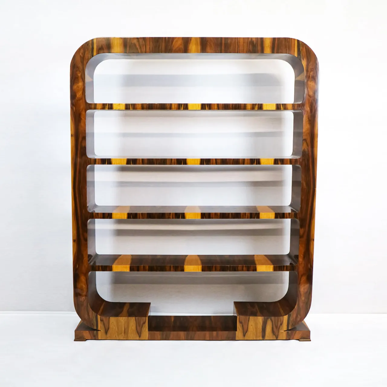 Eccezionalmente distintiva per la scelta di raffinate impiallacciature in legno, questa libreria bifacciale sfoggia un fascino accattivante e di forte impatto visivo. Perfetta per essere al centro di qualsiasi interno moderno, la sua forma aperta e bifacciale di ispirazione Art Déco è composta da una struttura in MDF impiallacciata con radica di palissandro indiano.
