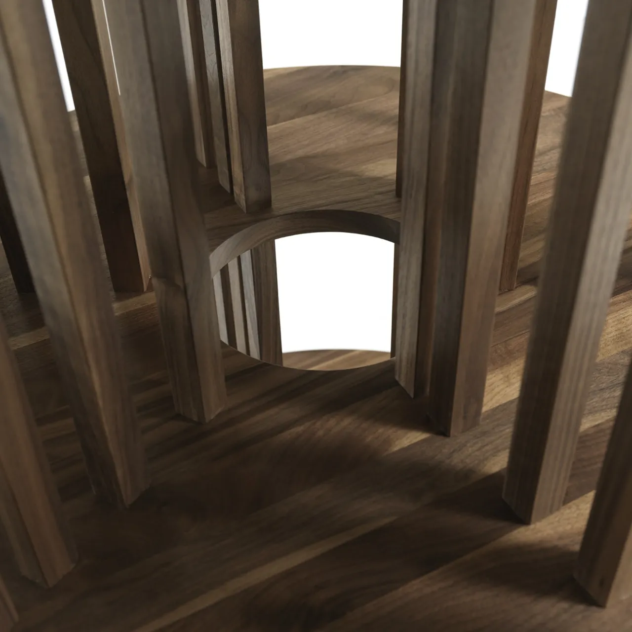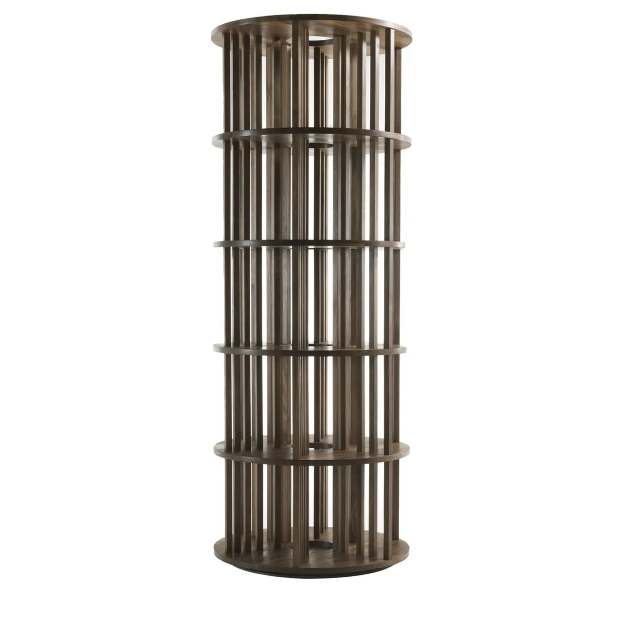 Chiamata così per l’elemento architettonico che richiama, questa raffinata libreria in noce senza nodi permette di esporre i libri in modo originale senza rinunciare all’eleganza. Sei ripiani a disco compongono il suo sistema di scaffalatura, tutti trafitti da barre verticali in legno per una stabilità impeccabile e per conferire alla struttura un aspetto arioso. Finitura a olio.