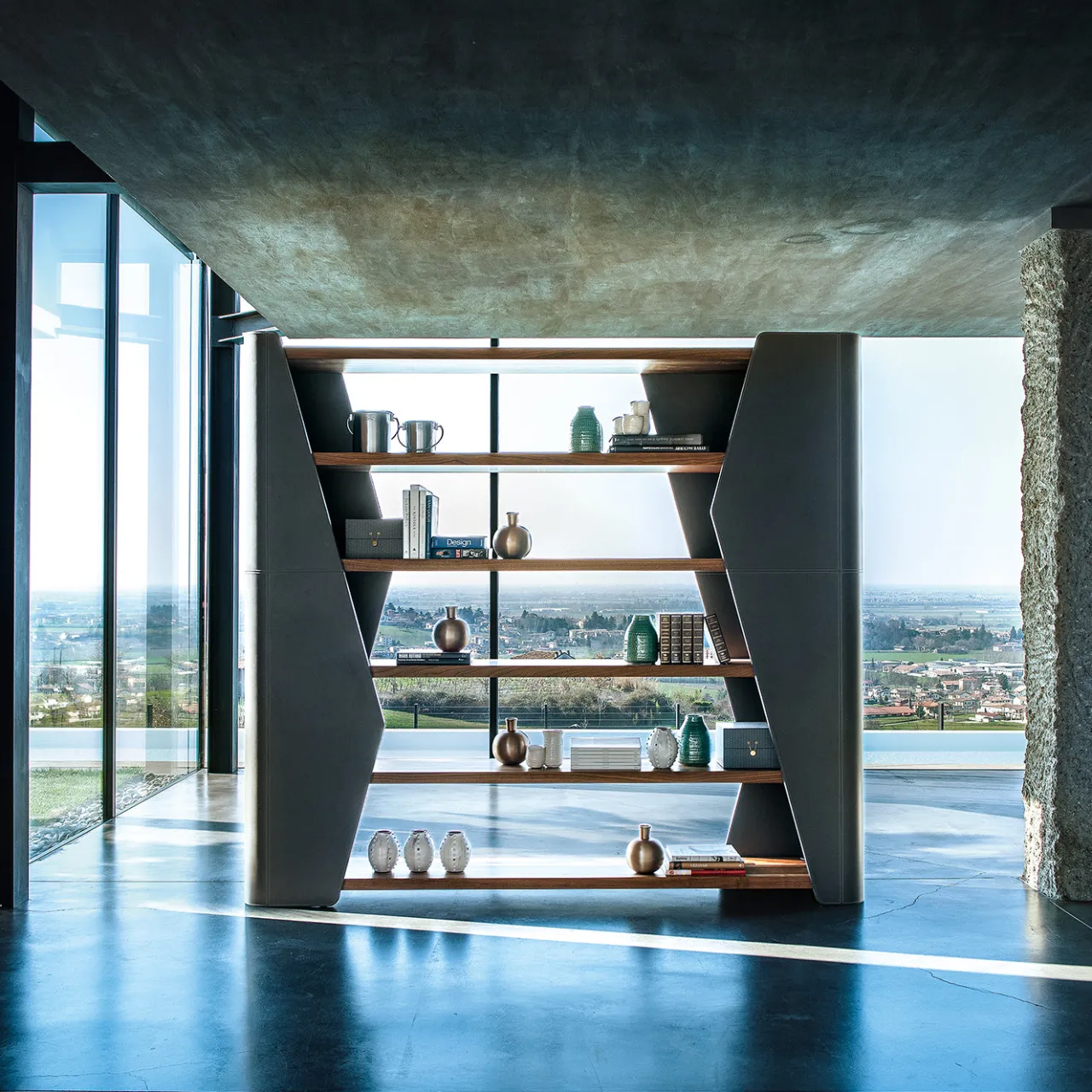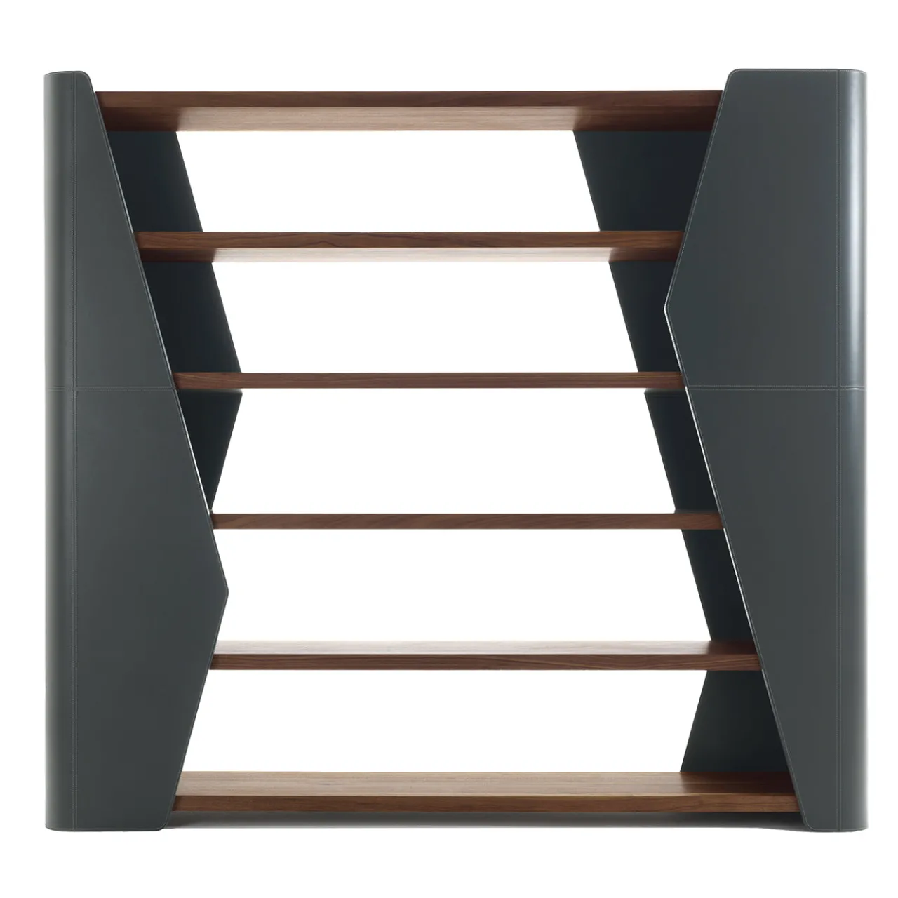 Finesse è una libreria dal design distintivo firmata da Karim Rashid, caratterizzata da montanti curvi e asimmetrici rivestiti in pelle Olimpia 18. Dispone di sei ripiani in legno di noce dallo spessore di 5 cm, perfettamente integrati nella struttura. Il noce, privo di nodi e rifinito a olio, esprime un’elegante combinazione tra la naturalezza del legno e la raffinatezza della pelle, dando vita a una soluzione contenitiva contemporanea e di grande eleganza.