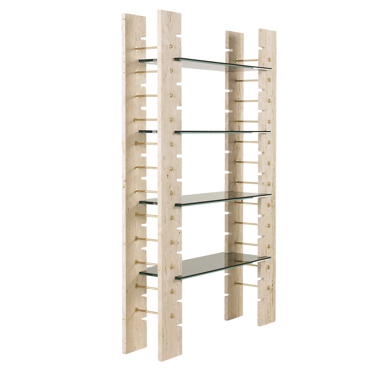 La linea Fitzroy incarna l’estetica industriale della Collezione Casa di Gianfranco Ferré, ispirandosi agli anni Settanta. Presenta una struttura in marmo Travertino a poro aperto, completata da barre strutturali in ottone opaco. Presenta ripiani accoppiati in vetro trasparente e fumé, creando un elemento espositivo elegante e funzionale. Ideale per esporre libri e oggetti d’arredo, la libreria aggiunge un tocco di raffinatezza a qualsiasi interno moderno.