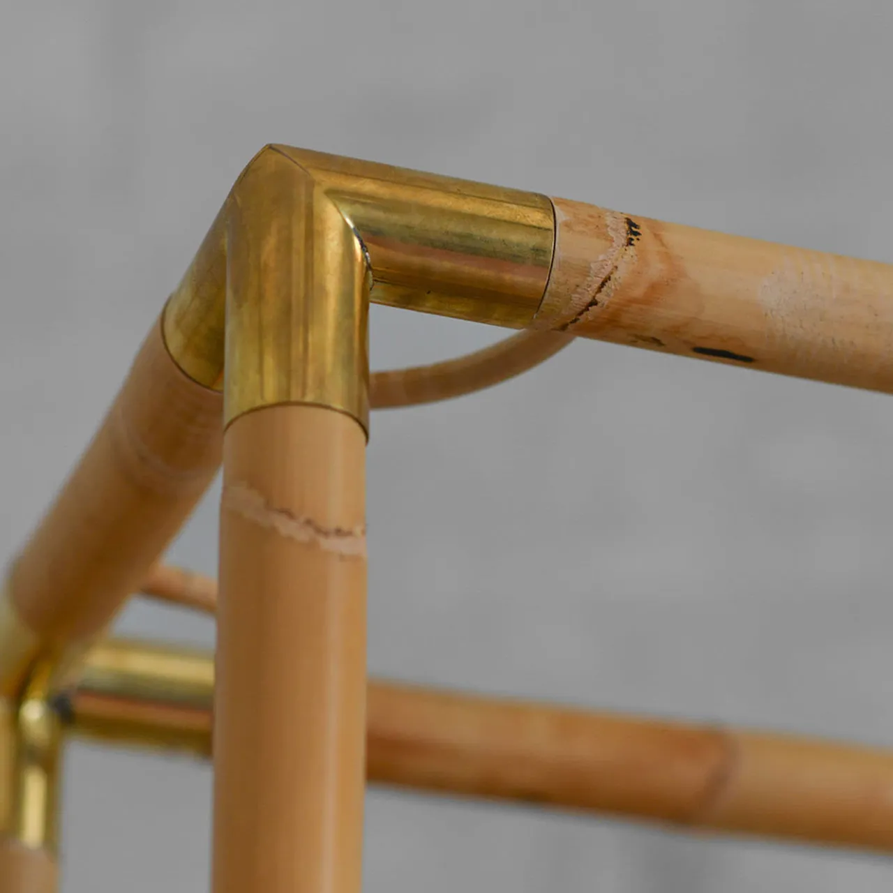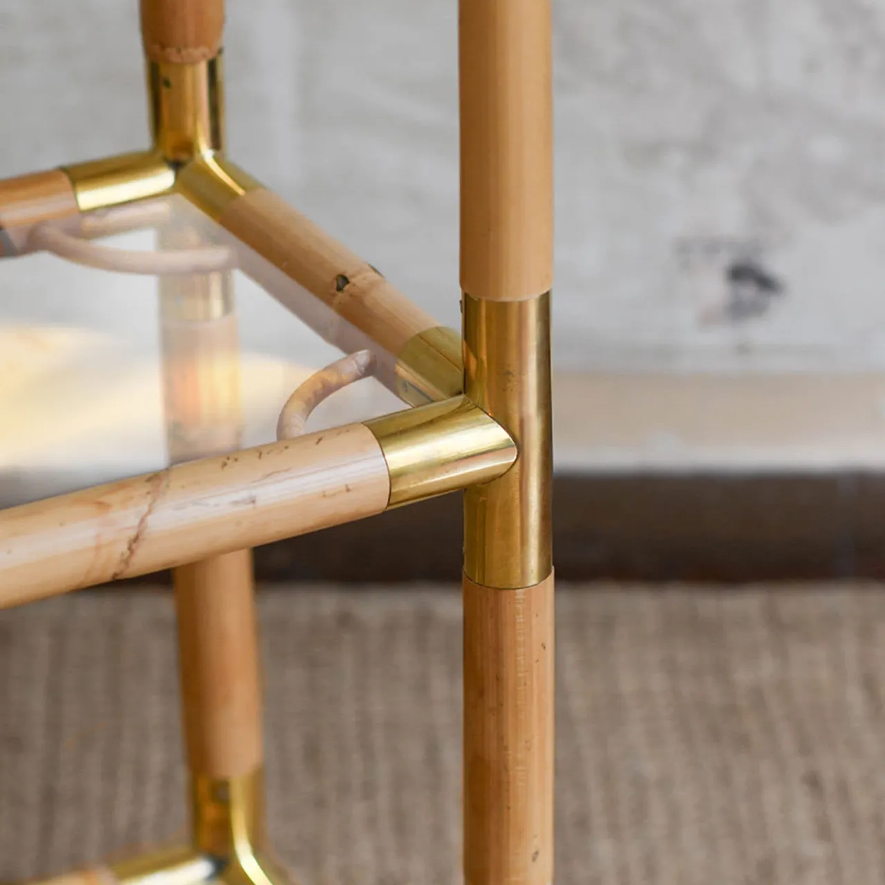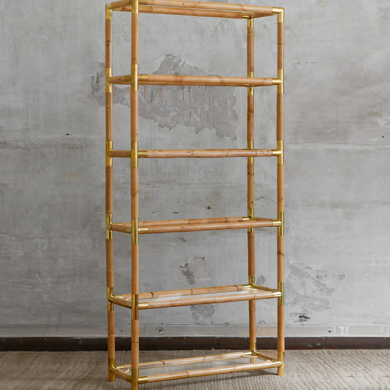 Parte della nuova serie “Raccordi”, questa libreria in bambù con finiture in ottone presenta cinque ripiani in vetro e una finitura di colore chiaro. Il mix di bambù, ottone e artigianato raggiunge un equilibrio armonioso tra design moderno e tradizione, con accenti estetici raffinati. È disponibile anche in finitura chiara.