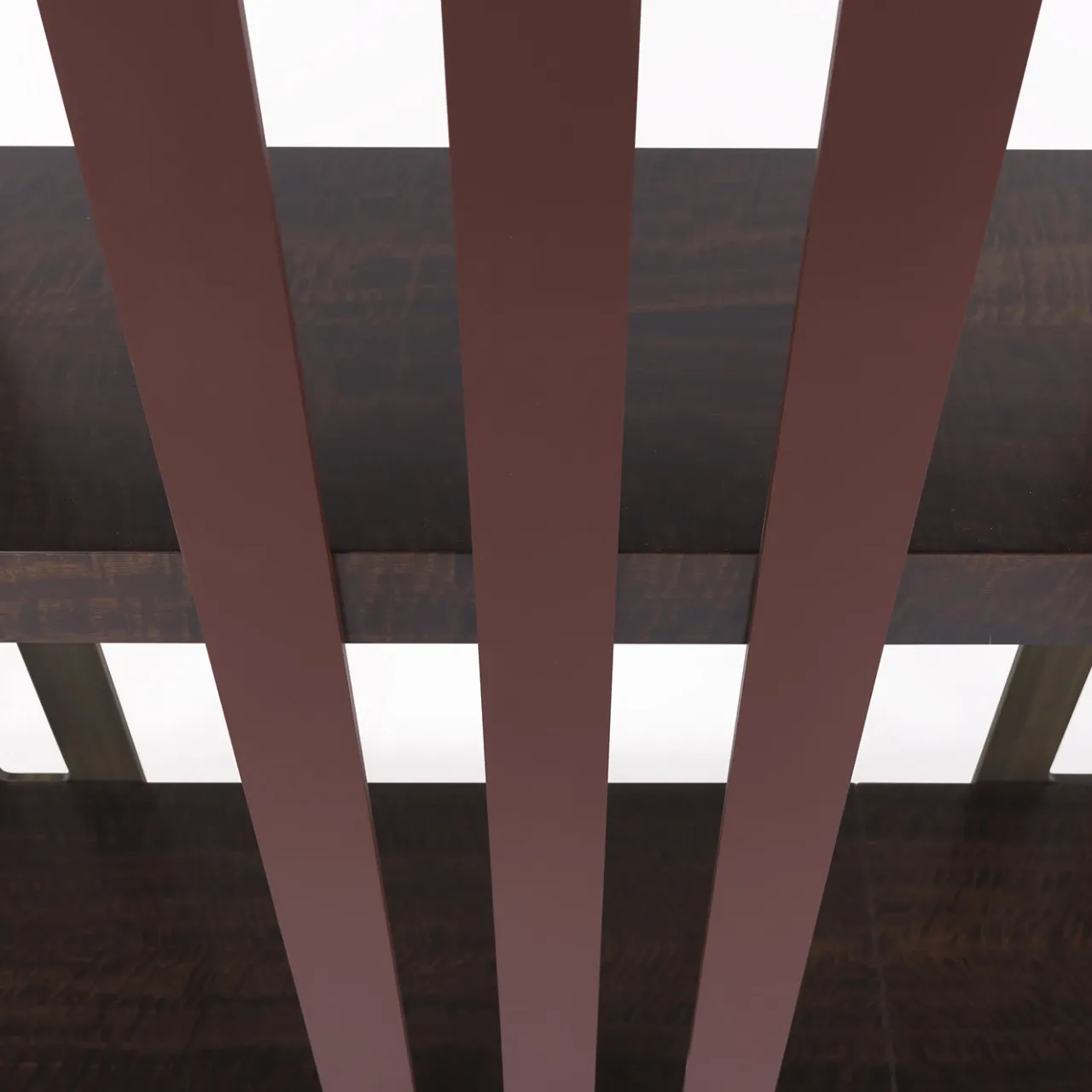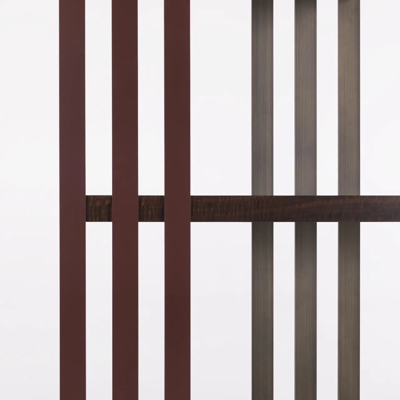 Un mix versatile e superbo di elementi in perfetto stile Etro Home Interiors: la struttura in metallo bronzato patinato con dettagli in finitura bordeaux, i ripiani in legno di eucalipto frisè affumicato e la forma che rimanda alla lettera iniziale del logo Etro contribuiscono a esprimere lo spirito poliedrico del marchio. Libreria Struttura in metallo patinato bronzo con dettagli in finitura rosso ciliegia. Ripiani in legno di eucalipto frisè affumicato.