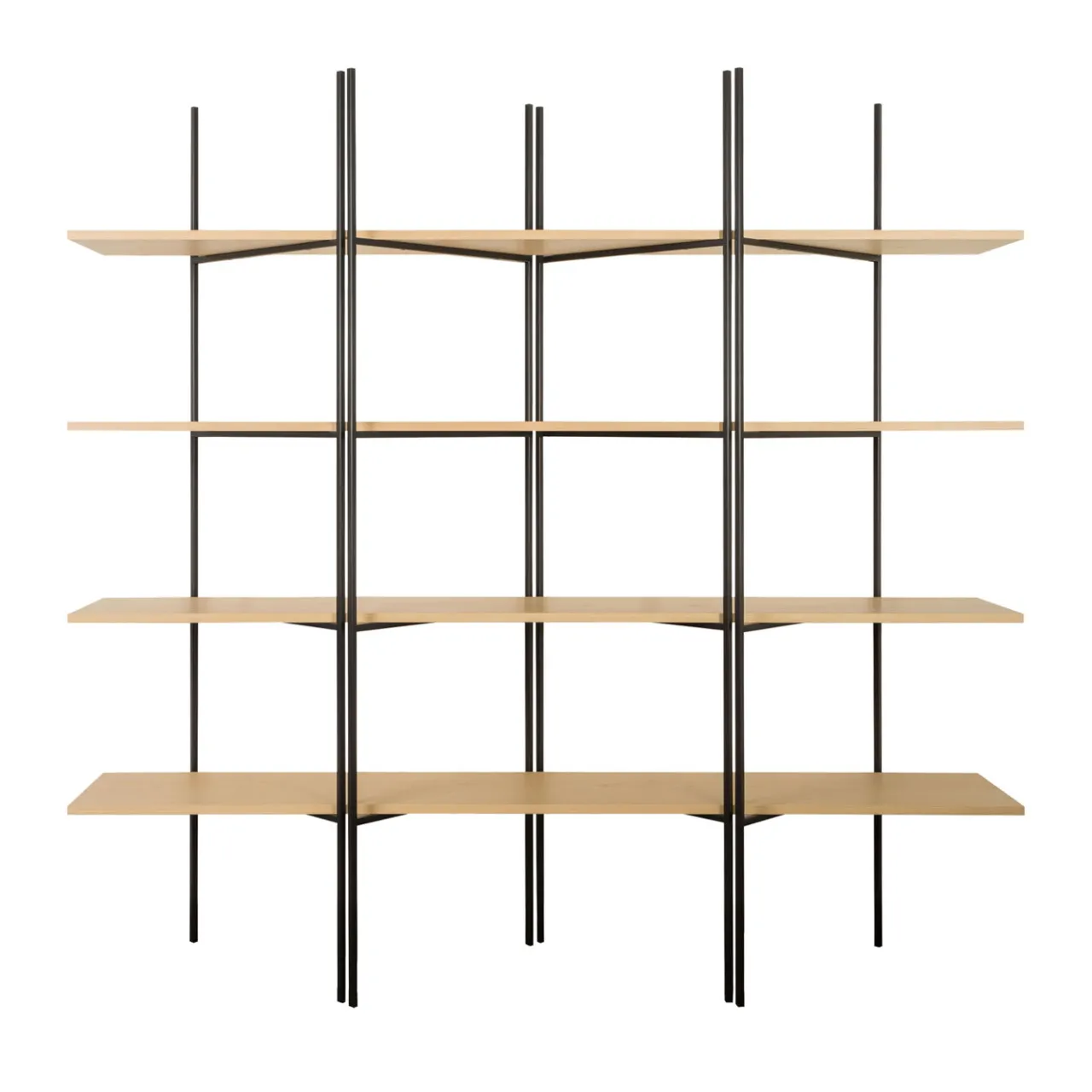 Spaziosa ma visivamente efficace, questa libreria moderna permette di esporre libri e oggetti da collezione e allo stesso tempo di separare spazi aperti, come uffici e loft. La struttura aperta e flessibile è composta da quattro ripiani in truciolato impiallacciato in legno (spessore 20 mm) che poggiano su un telaio in tubo d’acciaio quadrato (15 x 15 mm) rifinito in verde scuro che la rende visivamente leggera ma eccezionalmente robusta. La collezione modulare Ethrio permette di creare molteplici configurazioni di forma – lineare, angolare o trasversale – semplicemente spostando l’assemblaggio dei ripiani.