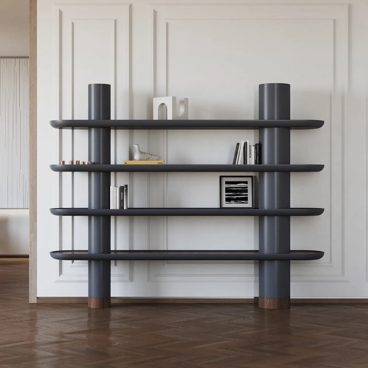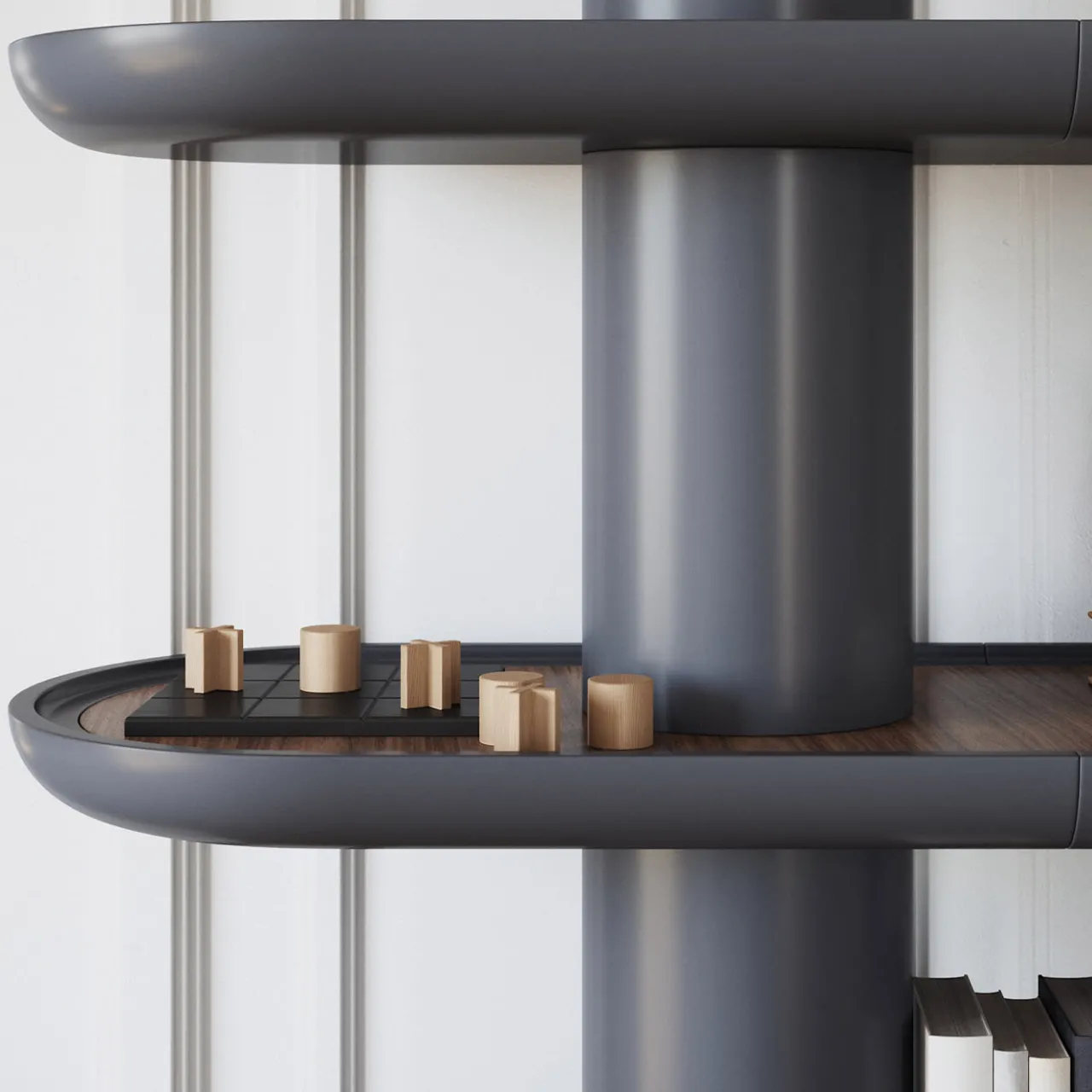 Inconfondibilmente moderna nelle sue linee pulite e nei suoi contrasti armoniosi, questa libreria è un’ottima aggiunta a soggiorni o studi. Per la struttura in legno laccato è stata scelta una profonda tonalità di grigio, la cui solida colorazione opaca si pone in elegante contrasto con l’impiallacciatura in legno di noce che arricchisce la superficie interna dei ripiani. Completata da un audace volume cilindrico, la struttura è disponibile anche con inserti in ceramica su richiesta al Concierge.