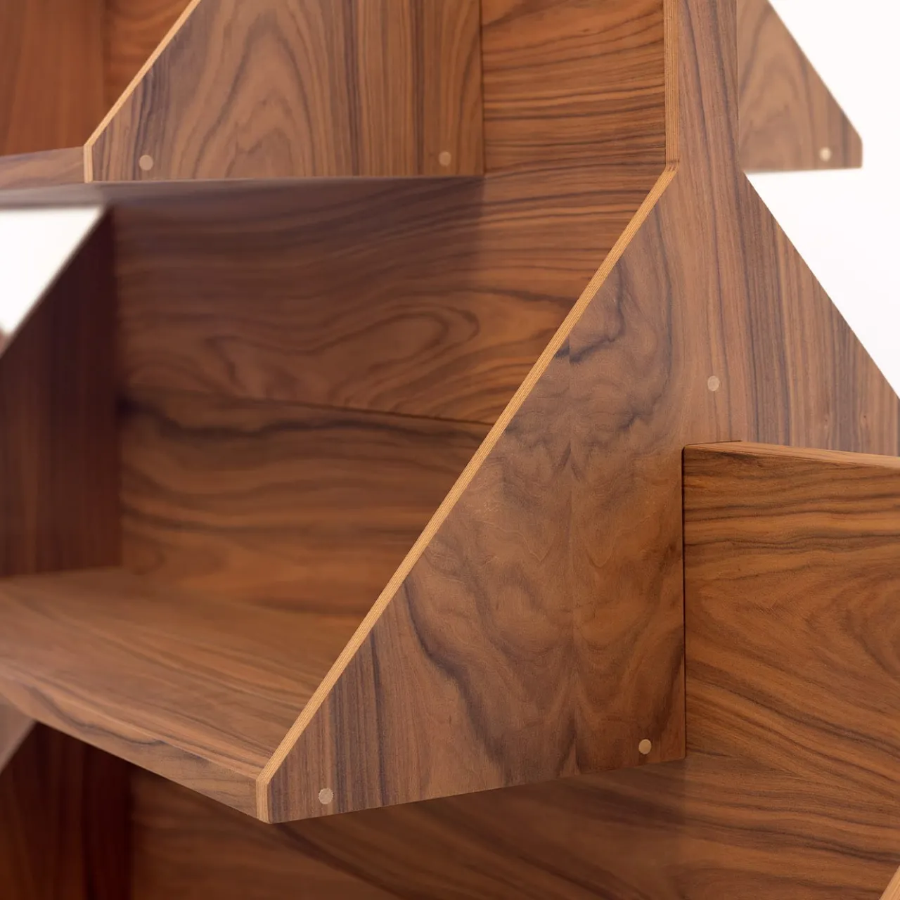 Icona del design contemporaneo, questa libreria appartiene a una serie esclusiva di progetti realizzati nel 1967 dall’architetto Ugo La Pietra. Composta da elementi impilabili in palissandro Santos e compensato, che possono essere disposti secondo il proprio gusto, presenta una struttura a E con due basi, due moduli bifacciali lunghi un metro, quattro moduli bifacciali lunghi 80 cm e sei moduli bifacciali lunghi 60 cm.