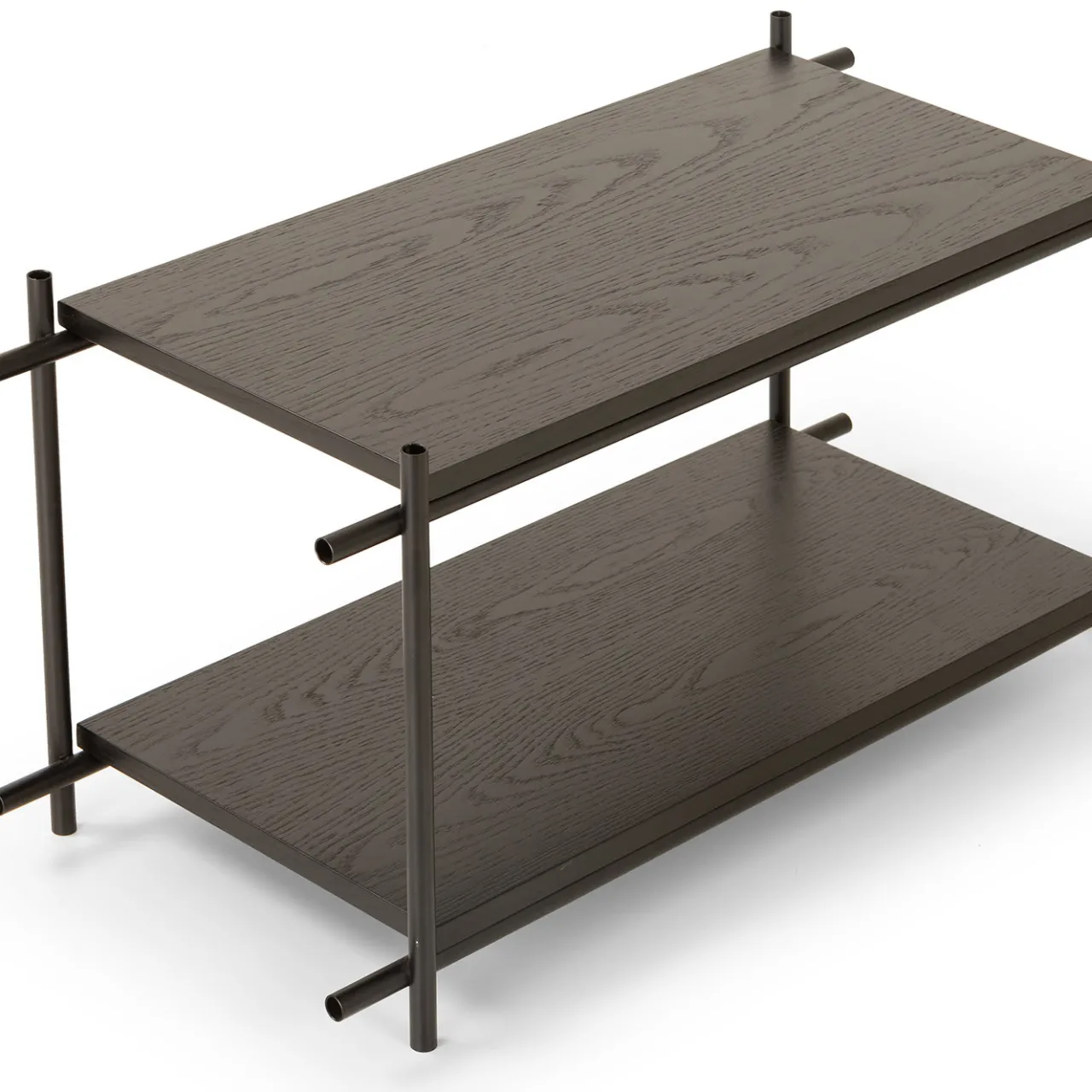 Elegante e funzionale, questa libreria monoblocco del sistema modulare Innocent combina linee pure e texture per dare forma a questo elegante design di Gio Tirotto. La struttura aperta è composta da due ripiani in legno di rovere verniciato nero collegati da tubi di ferro neri. Infinite combinazioni possono essere create impilando le unità per formare elementi d’arredo per una casa e un ufficio moderni e d’ispirazione industriale, da tavolini a consolle a librerie di diverse altezze.