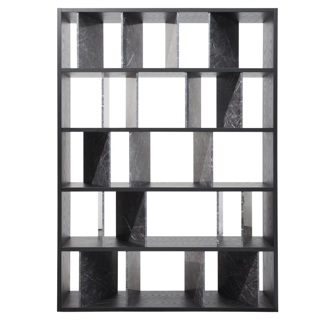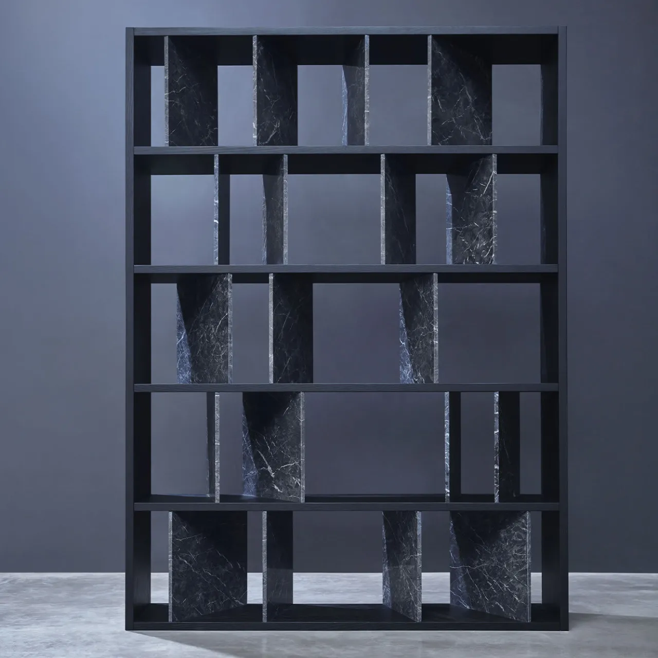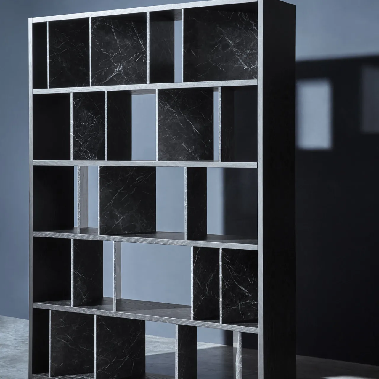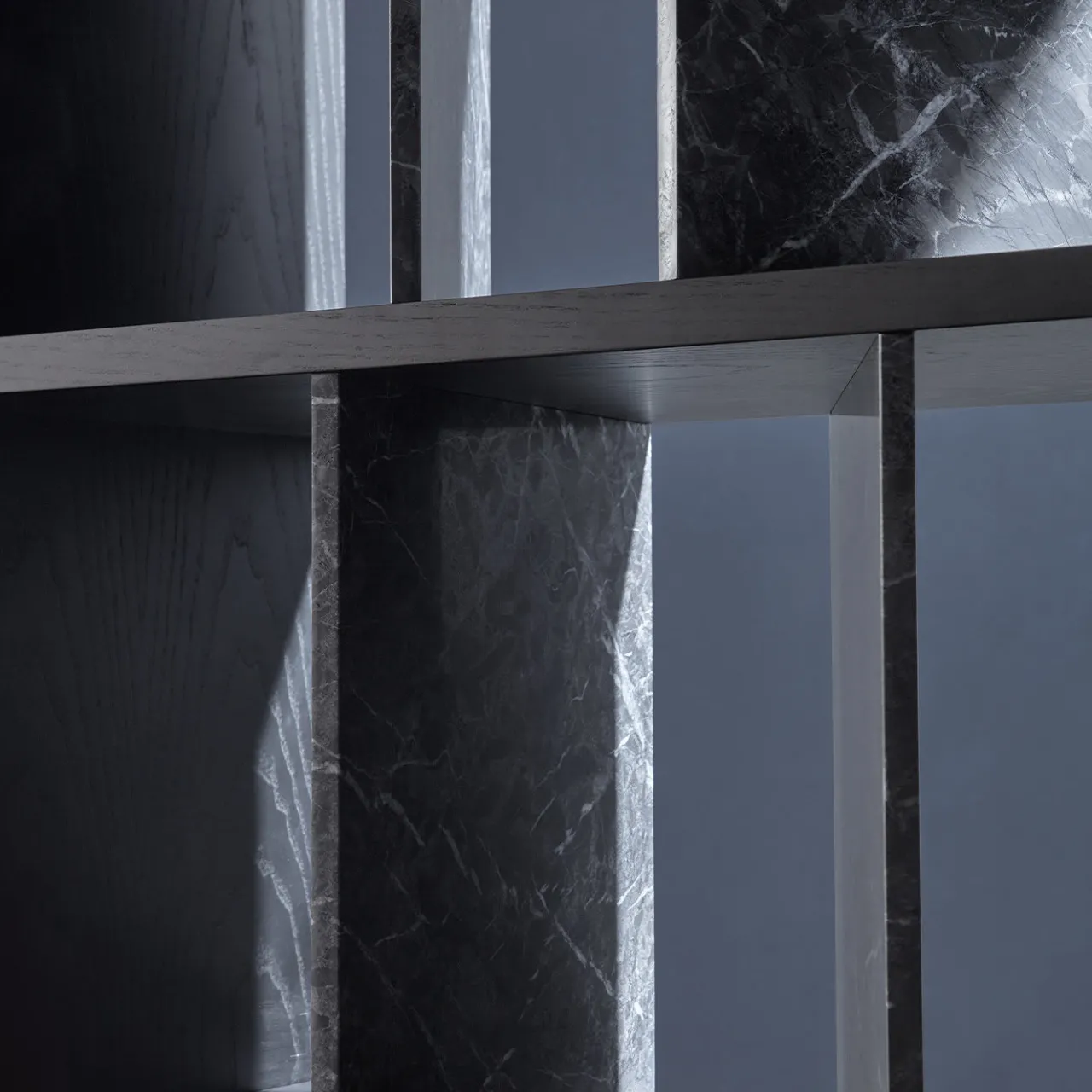 Questa libreria è un omaggio personale e intimo al paesaggio urbano di Milano, comprese le strade animate del quartiere Moscova con le sue ordinate e romantiche facciate in pietra. È disponibile in due versioni, una in marmo Carnico grigio scuro e legno di frassino laccato grigio (nella foto), l’altra in marmo Calacatta oro e noce Canaletto.