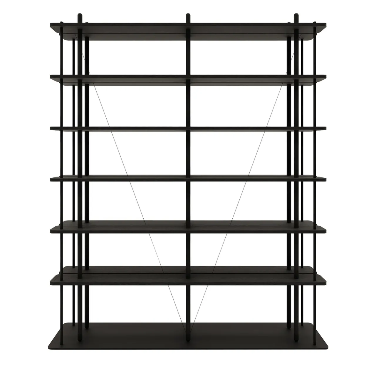 Zenobia deriva dal nome della città citata nell’opera di Italo Calvino “Città invisibili”. Una libreria nera con montanti a doppio telaio. I diversi diametri conferiscono un senso di movimento e profondità. Il legno e il metallo assorbono e riflettono la luce. I ripiani in acero corrono lungo tutta la libreria, dividendosi in due sezioni e conferendo permeabilità e leggerezza alla libreria. Quest’ultima è attraversata da cavi metallici ancorati alla grande piastra che ne costituisce la base.