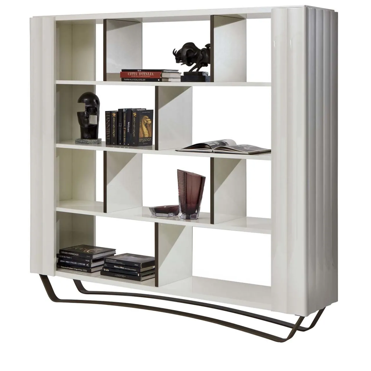Una costruzione architettonica che evoca la grazia classica delle colonne corinzie, questa libreria ha una struttura aperta in legno con finitura laccata bianca. Tre ripiani orizzontali sono interrotti da pannelli verticali disposti in modo casuale che creano una divisione irregolare dello spazio con un motivo accattivante. La base è composta da due listelli metallici curvi con finitura bronzata che riprende i dettagli frontali dei pannelli verticali. Elemento di spicco di qualsiasi salotto, questa libreria può essere utilizzata come elemento indipendente per creare una divisione spaziale e funzionale in un loft.