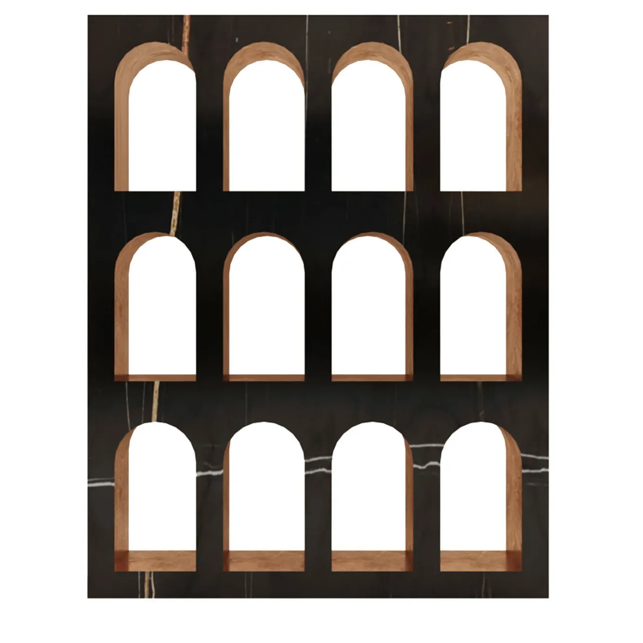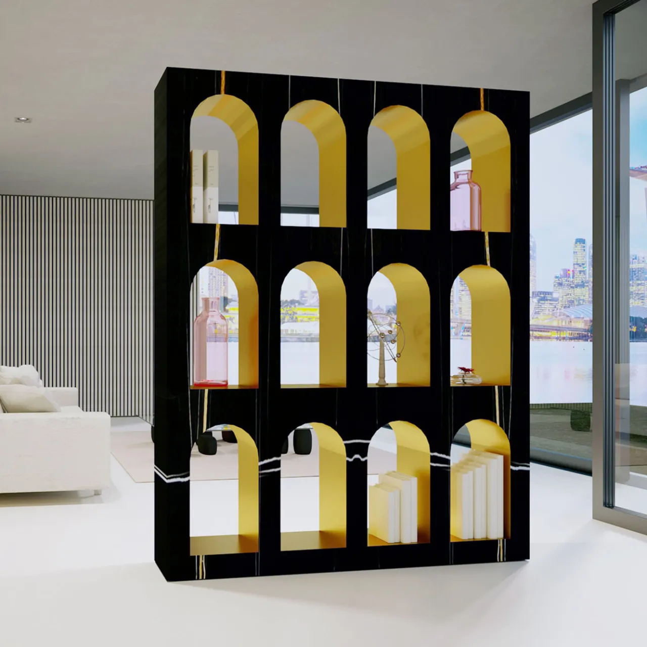 Con le eleganti venature oro e avorio del marmo Sahara Noir, la libreria Portici è una splendida aggiunta a un arredamento di lusso. Posizionata a parete o indipendente per creare una divisione fisica e visiva in una grande stanza o in un loft, questa sofisticata libreria ispirata all’architettura classica presenta angoli ad arco arricchiti da un interno con finitura dorata. Questo design impeccabile e singolare aggiunge un tocco sofisticato al compito di organizzare e decorare gli oggetti da collezione e i pezzi più cari.