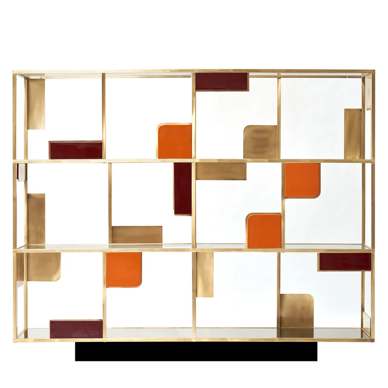 Parte della Collezione Sunset creata dagli architetti La Récréation – P.Angelo Orecchioni, questa straordinaria libreria aggiungerà un accento di raffinatezza a un arredamento contemporaneo, soprattutto se abbinata ad altre della stessa serie. Poggiata su una base in legno nero spazzolato, è racchiusa in una struttura in ottone con ripiani in cristallo extrachiaro e fondo in specchio bronzato. È interamente decorato con elementi geometrici in ceramica smaltata. Personalizzabile su richiesta.
