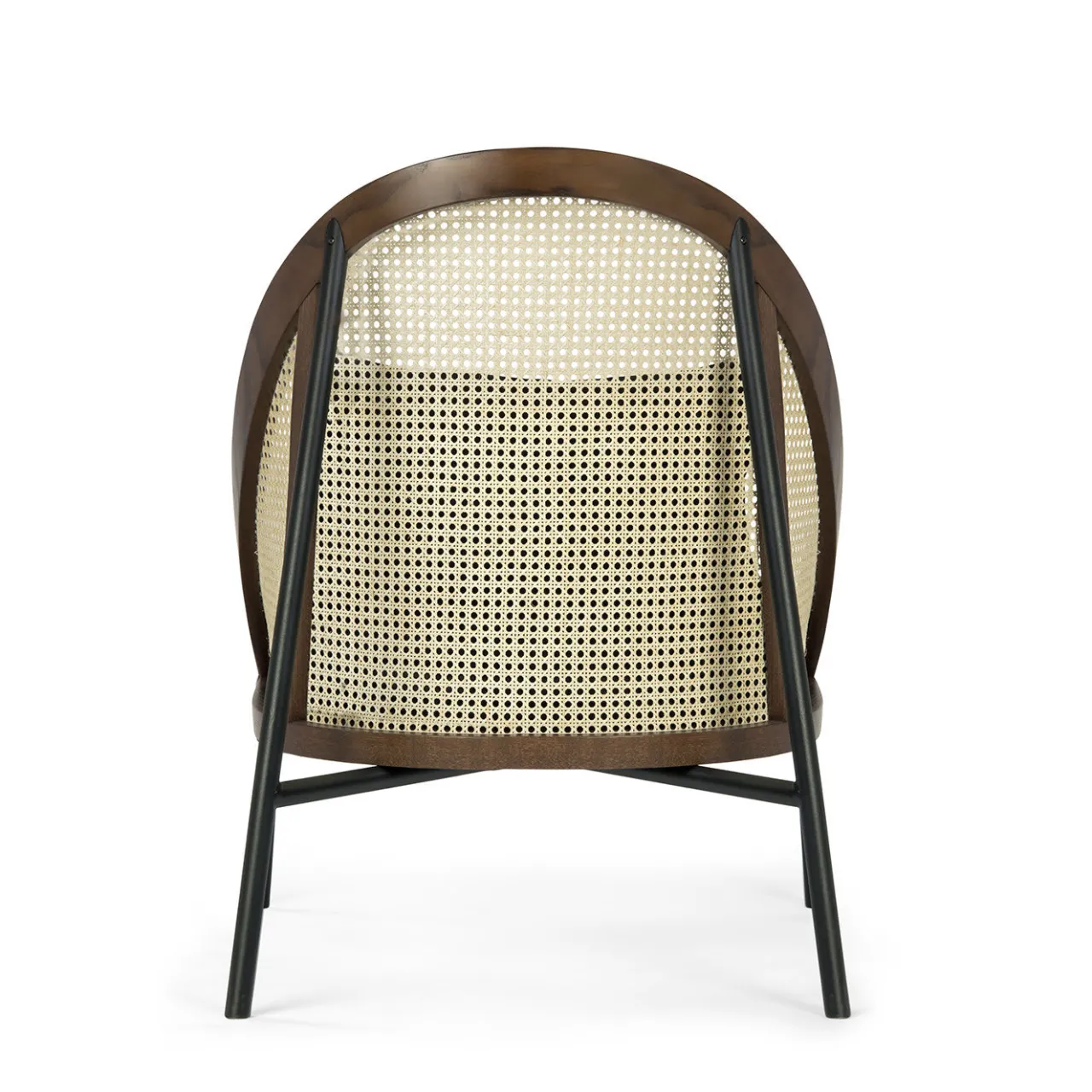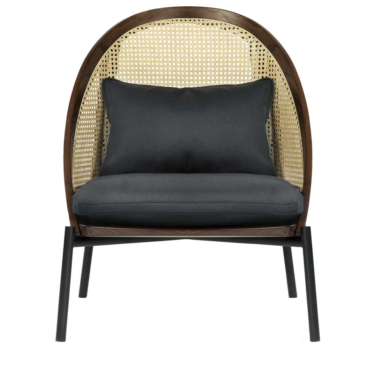 Elegante e accogliente, questa poltrona lounge è stata disegnata da Chiara Andreatti nel 2018. La sua silhouette è un’armoniosa combinazione di comfort e design raffinato, tradizione ed estetica moderna. L’elemento distintivo di questo pezzo è l’avvolgente schienale e i fianchi in paglia viennese, incorniciati da una struttura ellittica in faggio tinto noce, curvata con il metodo di vaporizzazione tipico di Thonet. La base è in metallo con finitura nera a polvere e cinghie in tessuto per sostenere i cuscini. Il legno è disponibile anche in nero laccato o in frassino naturale.