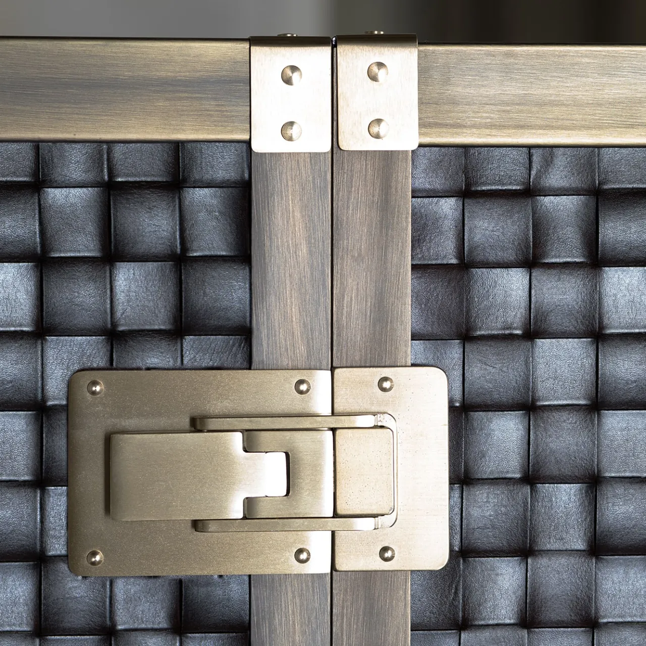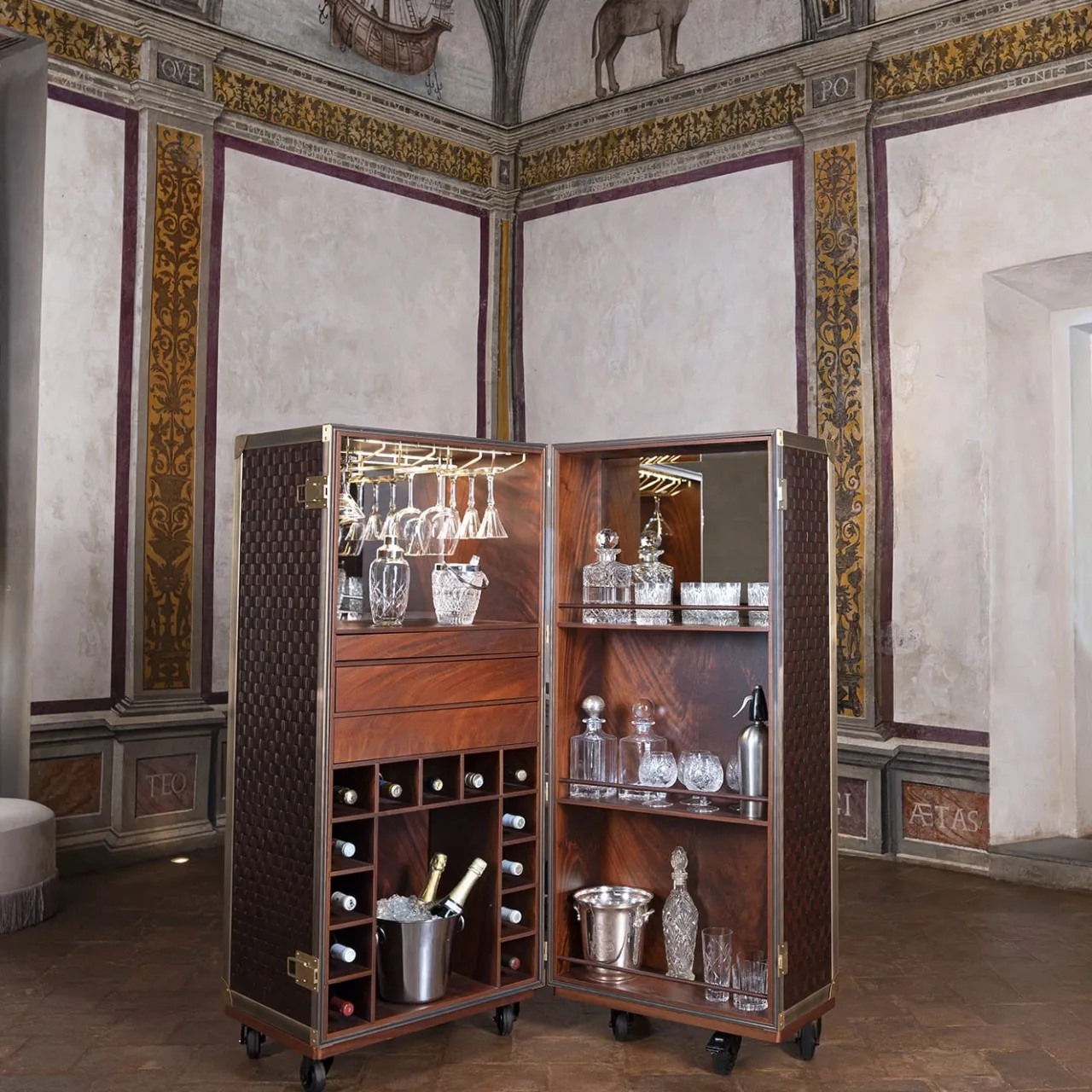 Il mobile bar “London” è progettato per ammirare e assaporare liquori rari ed esclusivi e vini pregiati. La parte esterna è rivestita in pelle intrecciata, con profili e maniglie in ottone bronzato. Le serrature e i paraspigoli sono in ottone opaco. La parte interna è in legno di mogano, con dettagli in pelle e specchi bronzati in tinta. La retroilluminazione a LED è inclusa.