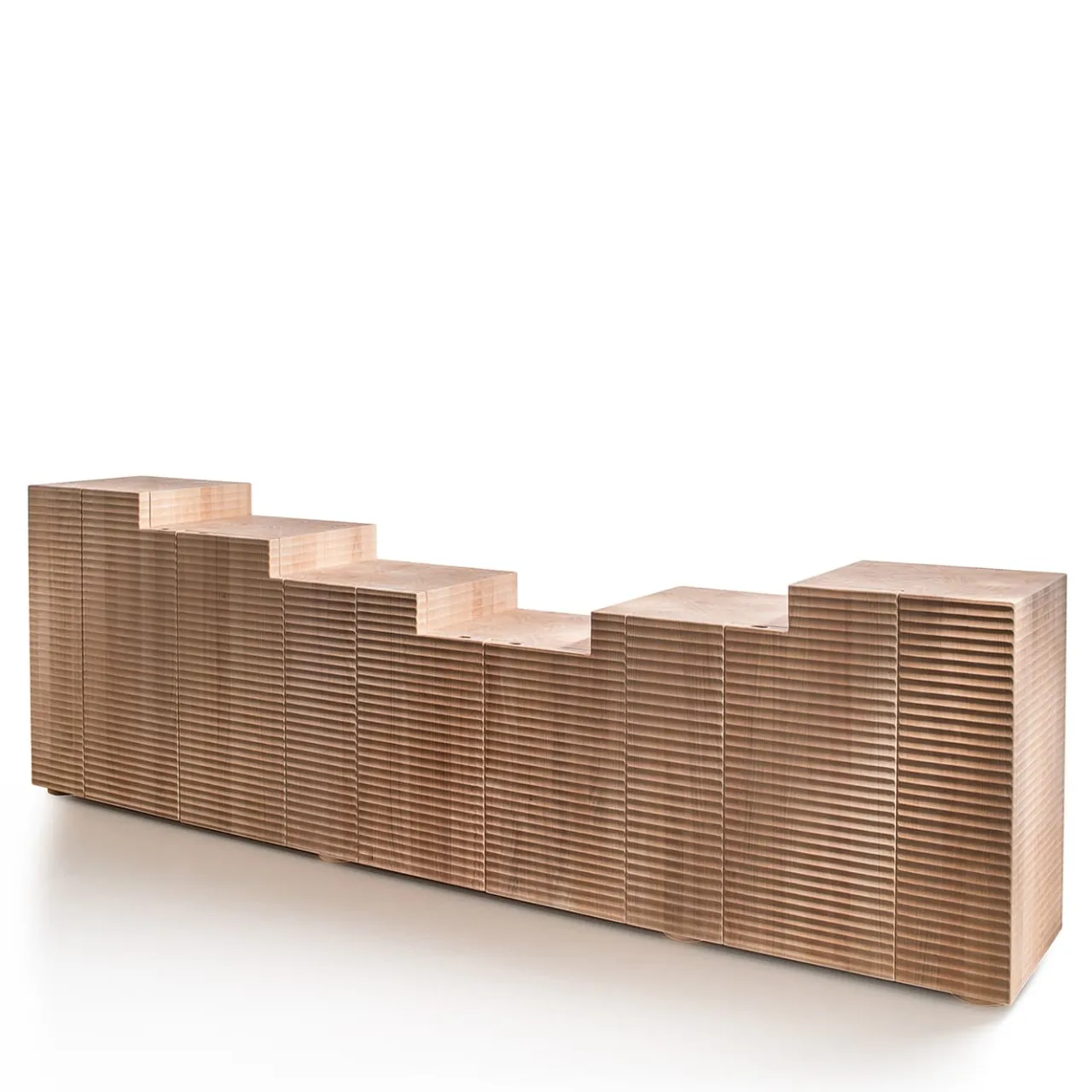 Contenitore monolitico a cinque ante, costruito con fibra verticale. Superfici intagliate con pialla e sgorbia a mano. Bulloni nascosti in acciaio brunito e cerniere invisibili.