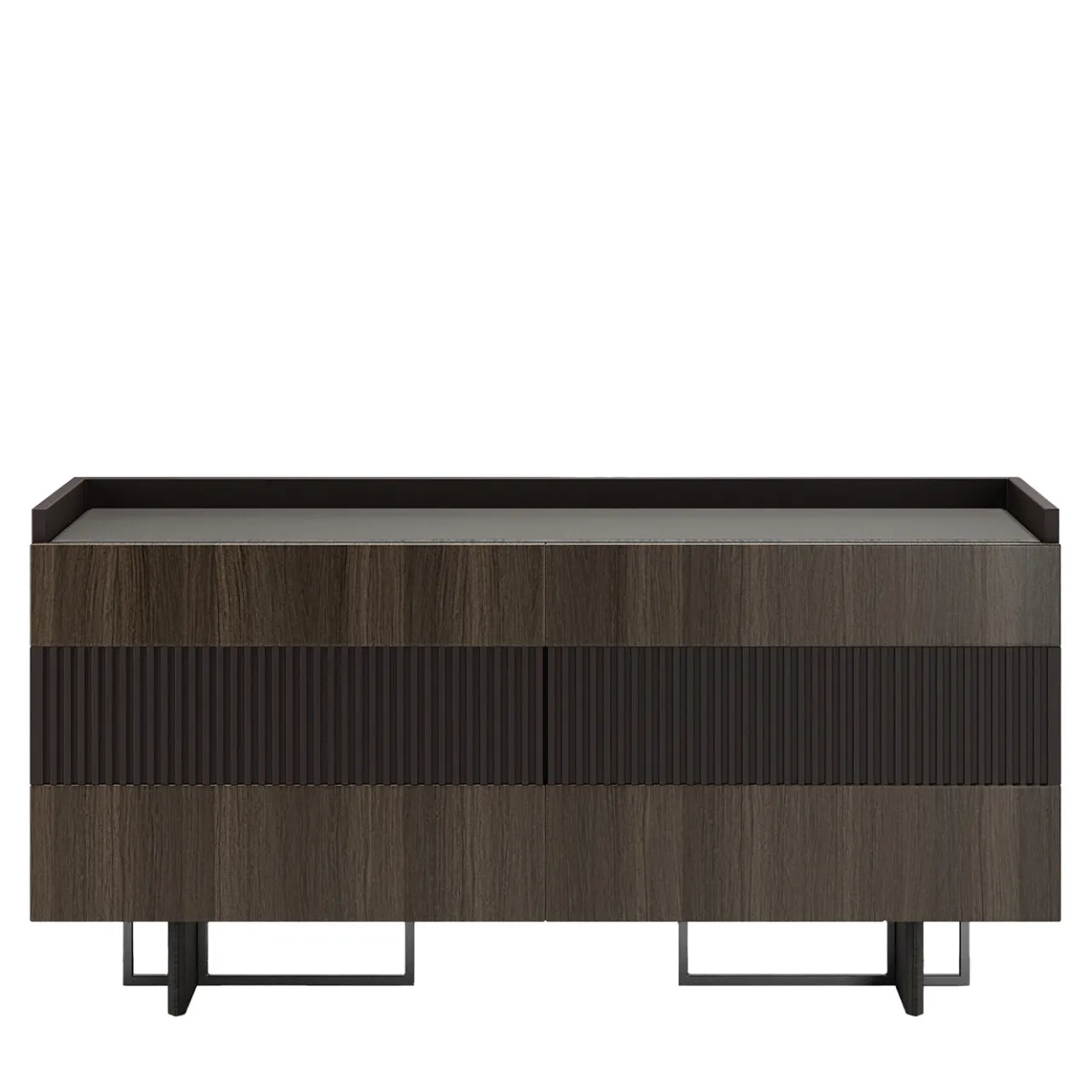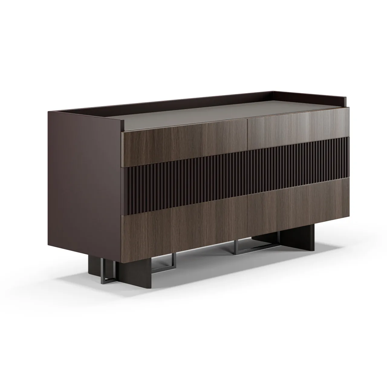 Questa credenza combina materiali pregiati e dettagli sofisticati in una struttura in legno laccato con piano rivestito in pelle. Il fronte è composto da quattro cassetti in impiallacciatura di legno con apertura push-pull e due cassetti in legno laccato arricchiti da un elegante motivo rigato. La base poggia su due pannelli rivestiti in pelle, completati da telai in metallo. Disponibile in una vasta gamma di finiture personalizzabili in pelle, tessuto, legno e metallo, per un design su misura. Per ulteriori informazioni si prega di contattare il Concierge.