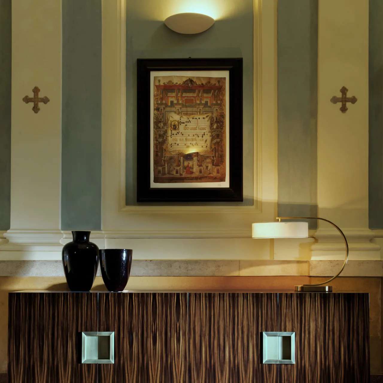 Accento sofisticato ed elegante contenitore, questa credenza fa parte della serie Gilbert e può essere utilizzata per creare una decorazione unica in un ingresso, un soggiorno o una sala da pranzo, aggiungendo anche un ampio spazio per una varietà di oggetti. La struttura in legno è rifinita con pregiata impiallacciatura in ebano Macassar sui quattro pannelli frontali delle ante, che si aprono in quattro scomparti, ciascuno diviso da un ripiano interno. Le maniglie in metallo con finitura galvanica completano il design. Da solo o abbinato al mobile alto Gilbert, questo pezzo sarà accattivante e funzionale.